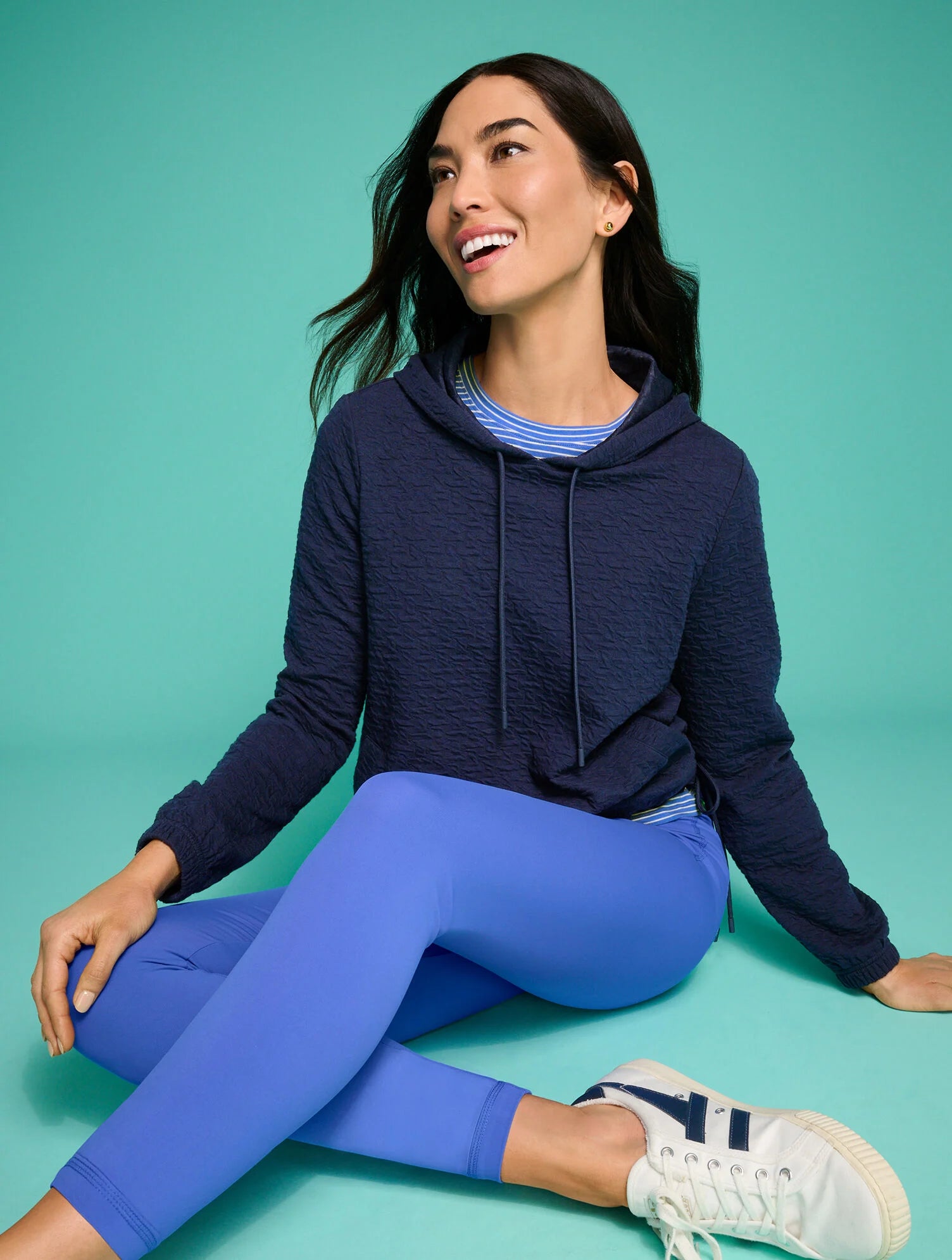 Effortlessly transition from running errands to leisure time in this essential hoodie. Crafted in a beautiful puckered jacquard texture with welt pockets and a sporty drawcord hem.