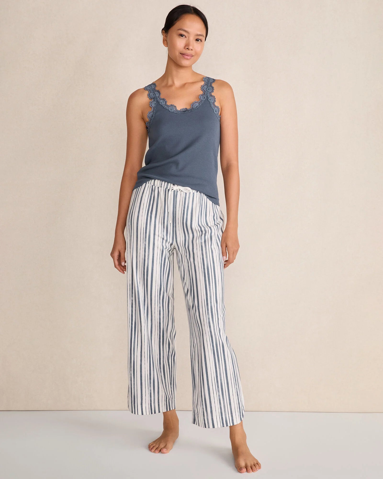 Delicate lace detailing meets a breathable organic cotton rib knit fabric. With a scoop neck silhouette and flattering lace trim, this sleep tank will help you drift off to sleep in pure comfort and style.