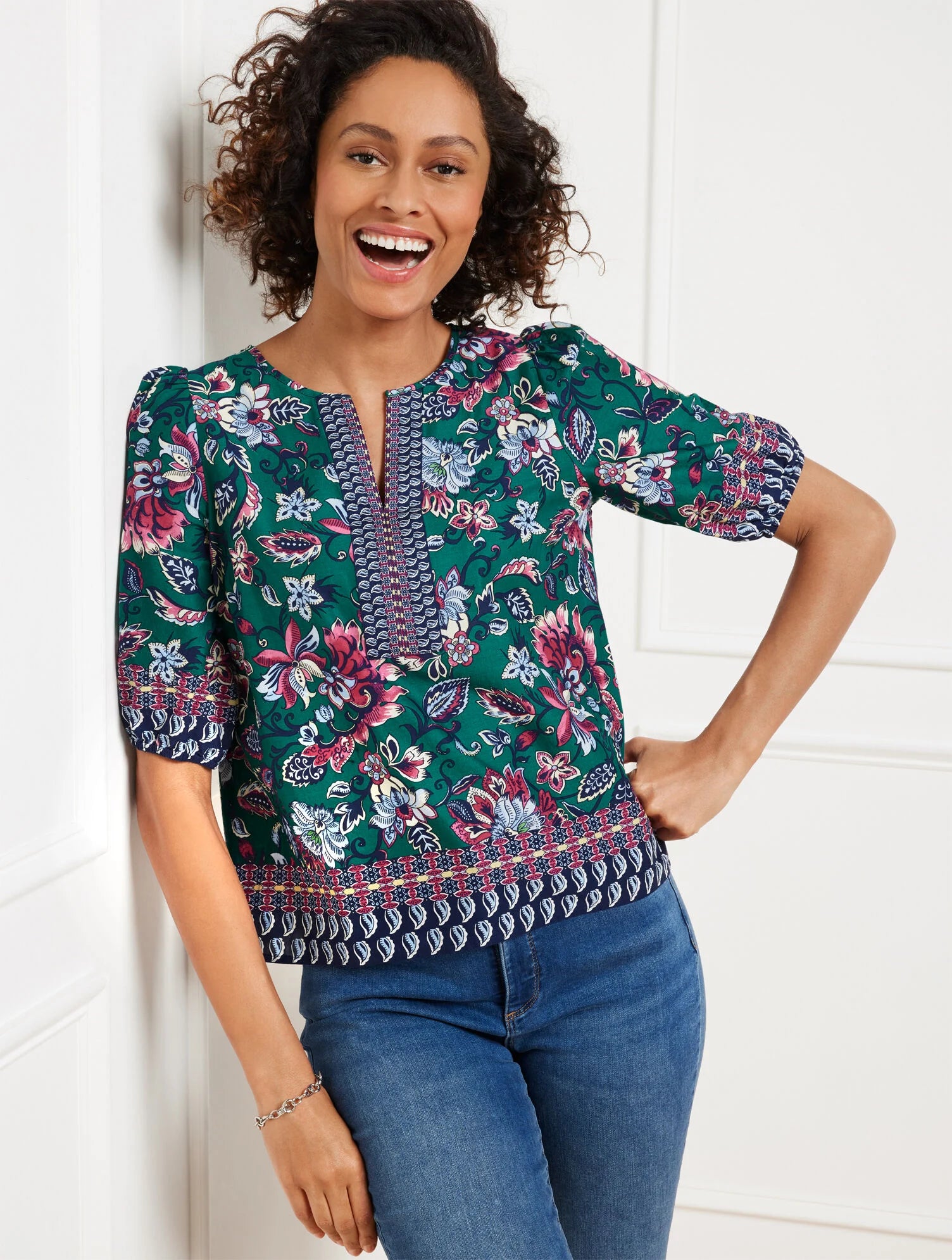 Our modern popover shirt in a short silhouette. Crafted from soft cotton with chic elbow-length sleeves. In a gorgeous garden border print. Looks fabulous with your favorite pencil skirts or jeans.