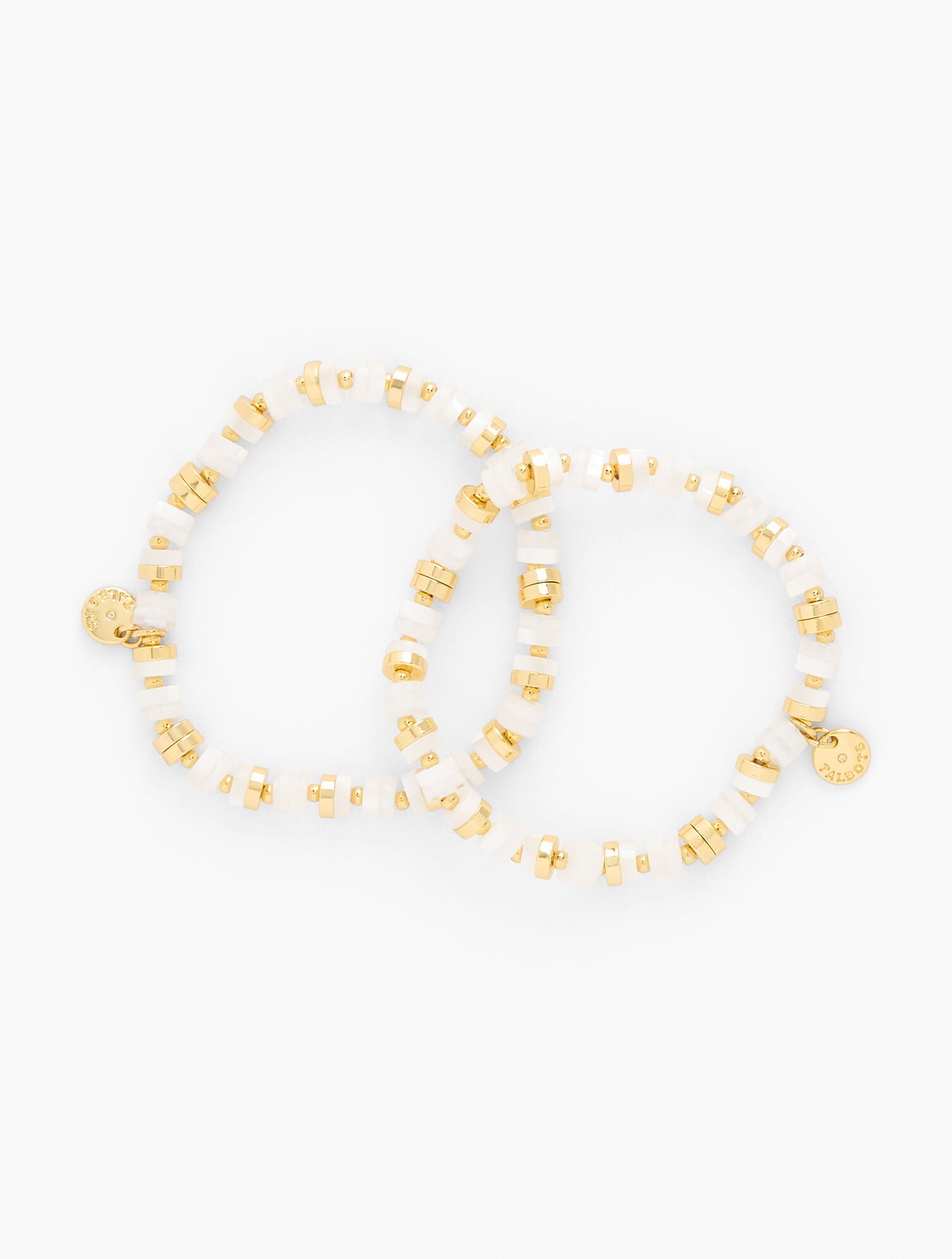 Accent your ensembles this season with these radiant beaded bracelets. Set of two is strung on easy-on, easy-off stretch bands. Perfectly stackable. Set of two.