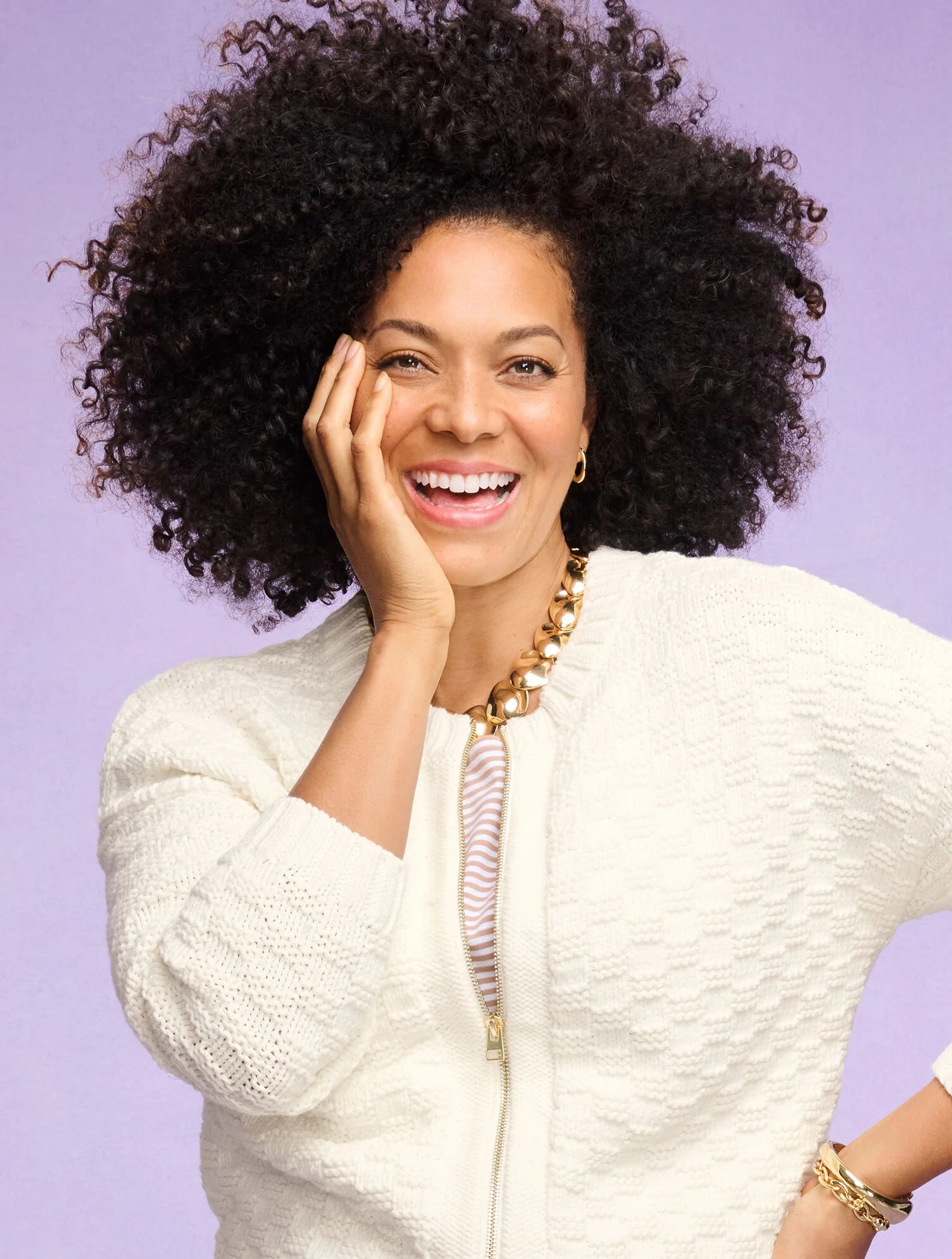 Our classic cardigan in a sporty-chic bomber silhouette with a textured check pattern. Your new cool-weather favorite.