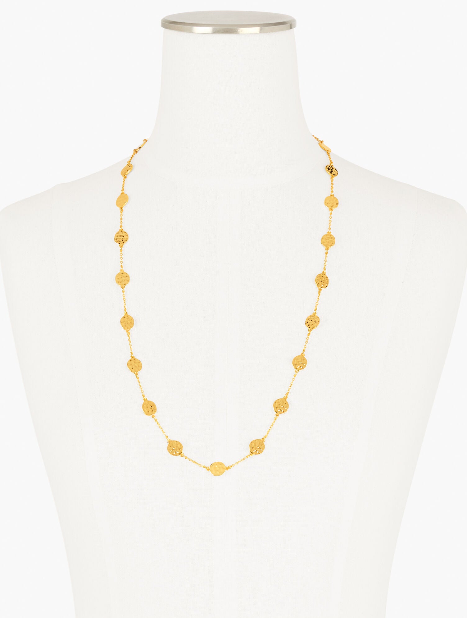 Our delicate necklace radiates with gold-tone discs stationed on a sleek chain. A luxurious add-on to your day or evening look.