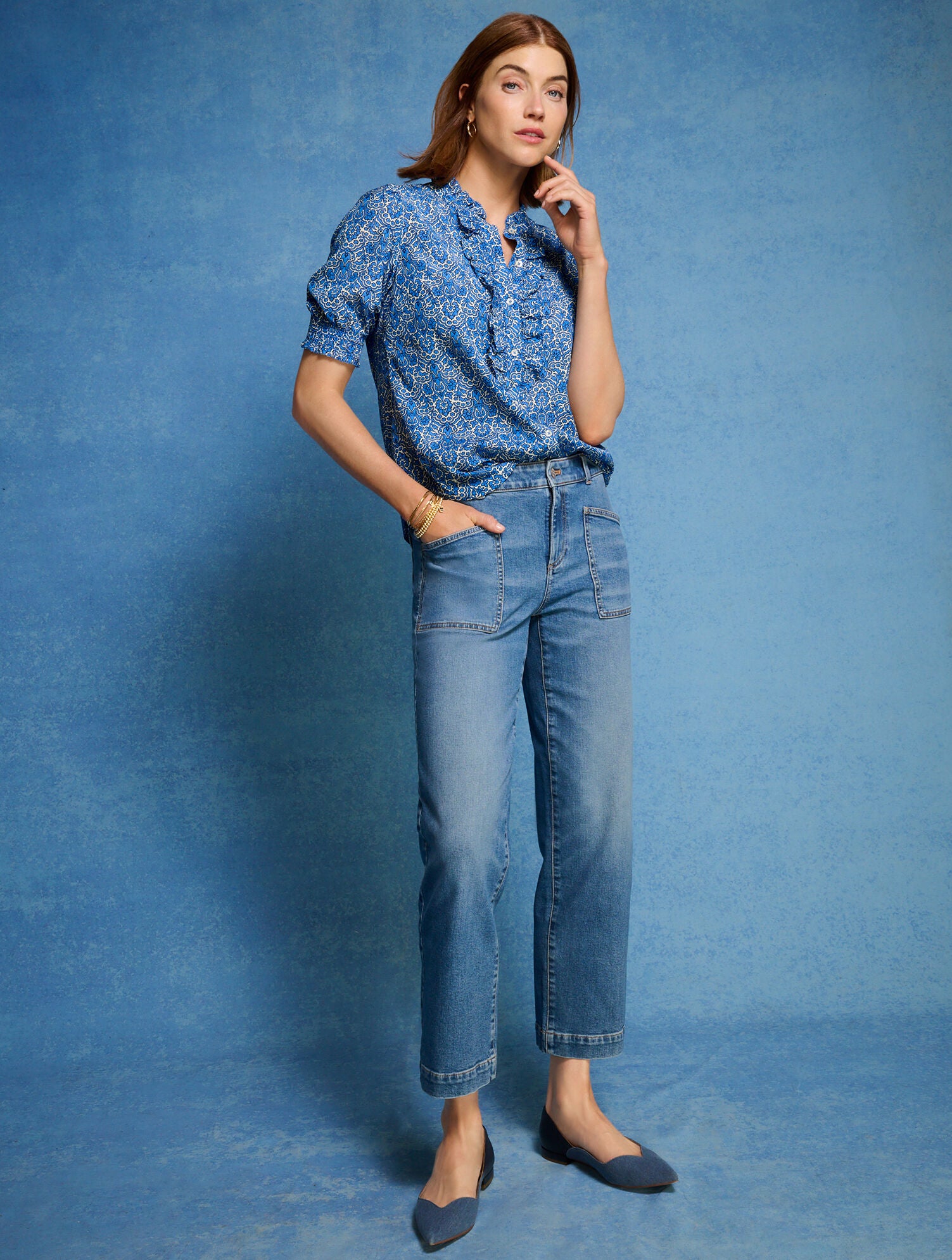 A vibrant woodland damask accents this feminine button front top. Detailed with fluttery ruffles and chic elbow-length sleeves. Simply stunning. A closet must-have.