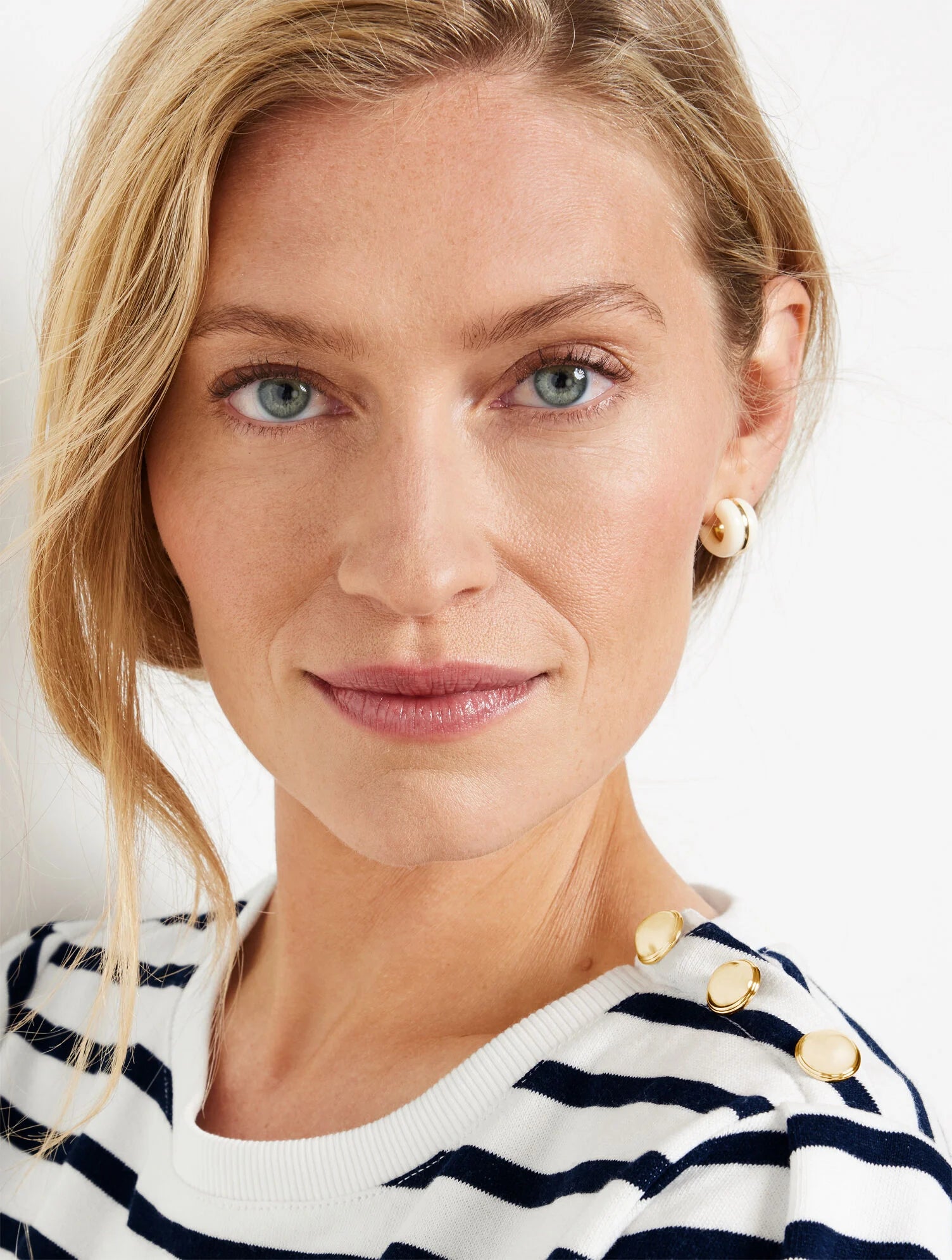 Allover stripes and buttons at the shoulders accent our must-have crewneck sweatshirt. Crafted with easy elbow-length sleeves. An elevated closet essential.
