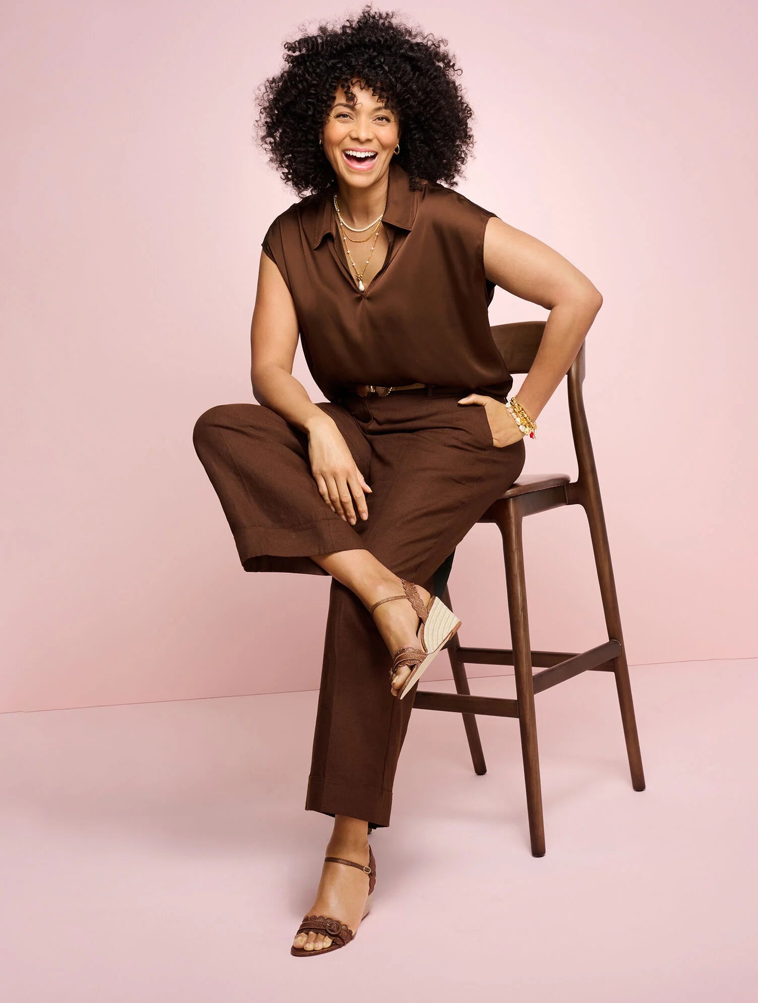 Elevate your closet this season with our silky satin charmeuse top. Detailed with easy extended shoulder seams.
