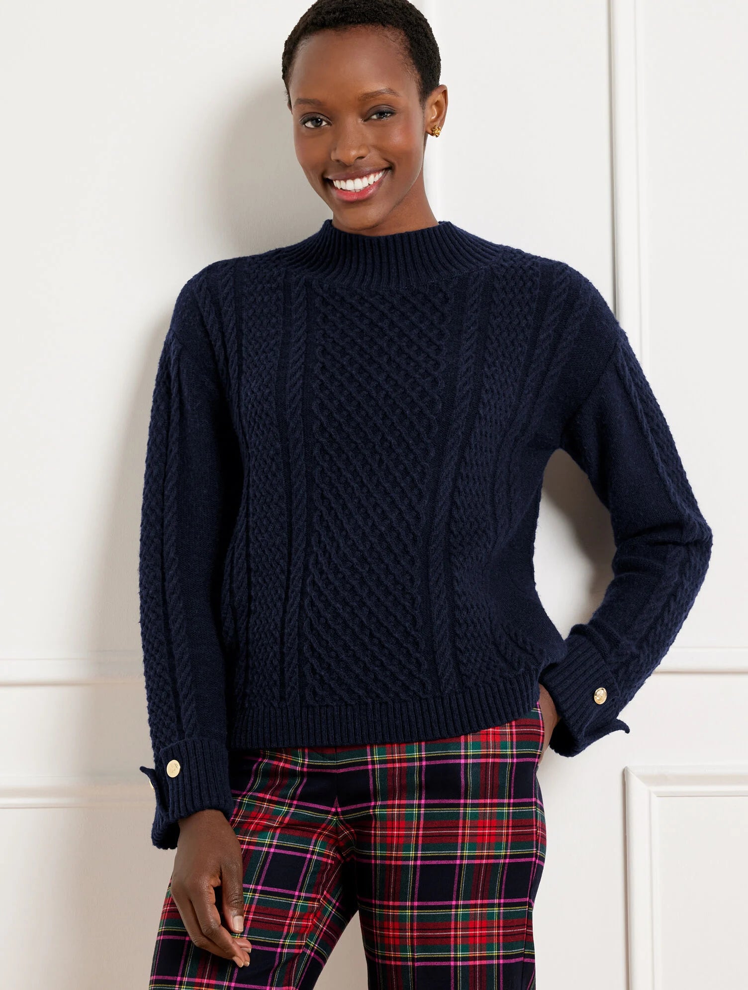 edit below Decorative buttons at the sleeve cuff add a refined touch to our incredibly soft sweater. Crafted in a classic cable knit texture with a wide mockneck.