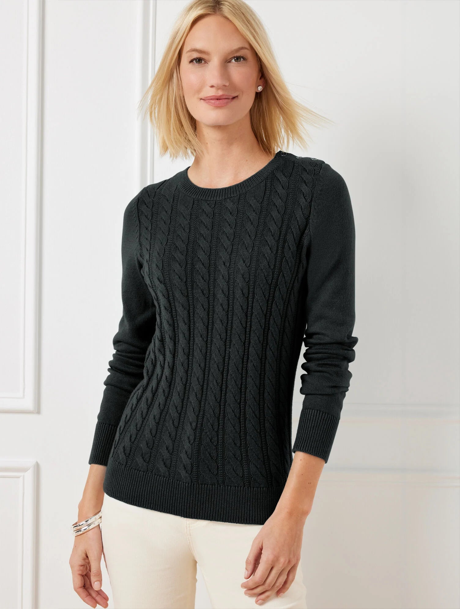 Our cozy crewneck sweater in a soft cable knit texture. Detailed with sleek buttons at the shoulder. Perfect for whatever the day brings.
