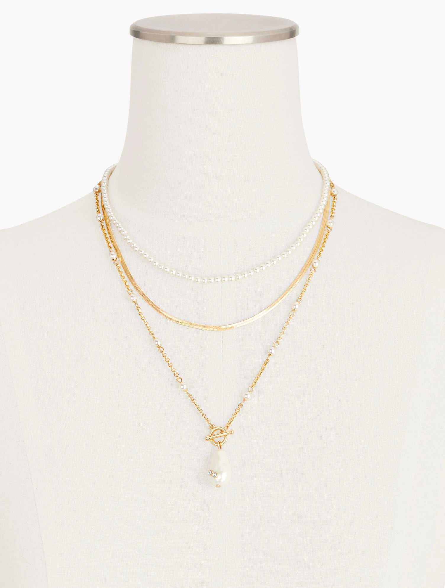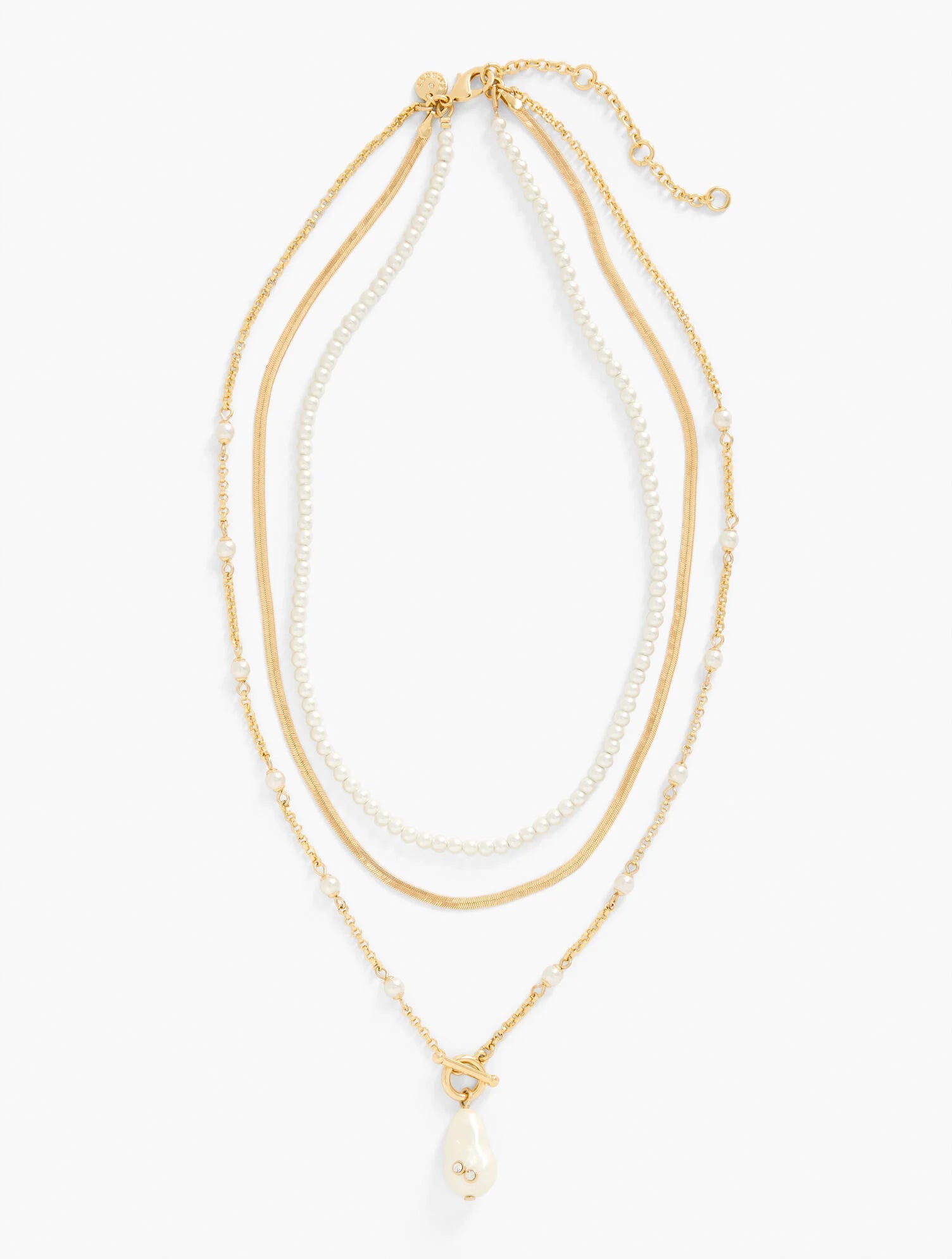 Elevate your favorite ensembles this season with the luminous glow of this layered necklace. Crafted with glossy stationed pearls, a gold chain and a pretty baroque pearl pendant.