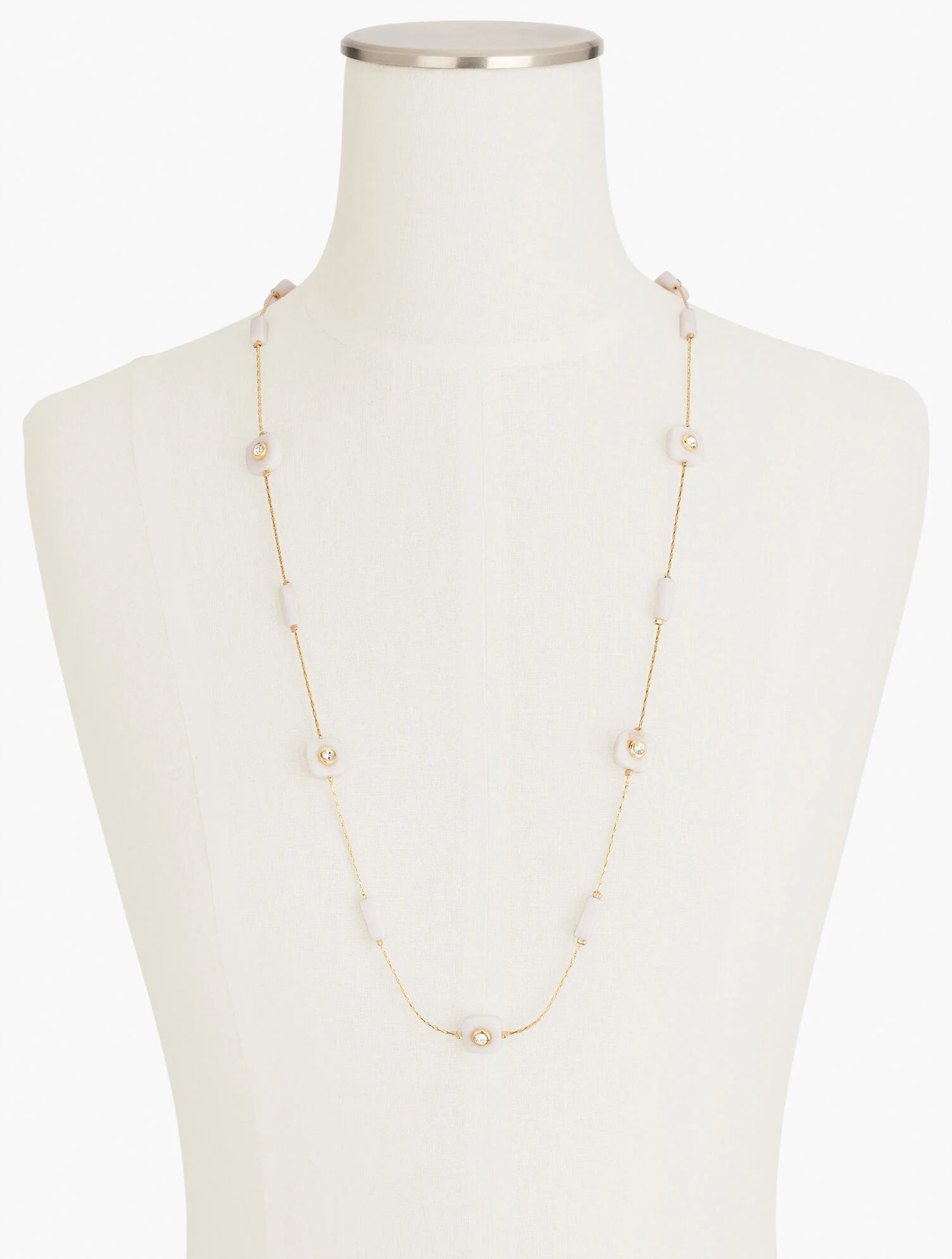 Make a chic statement with this striking necklace. Crafted with beautifully shaped stones and a touch of gold. Can be worn long or wrapped twice for a short, layered look.