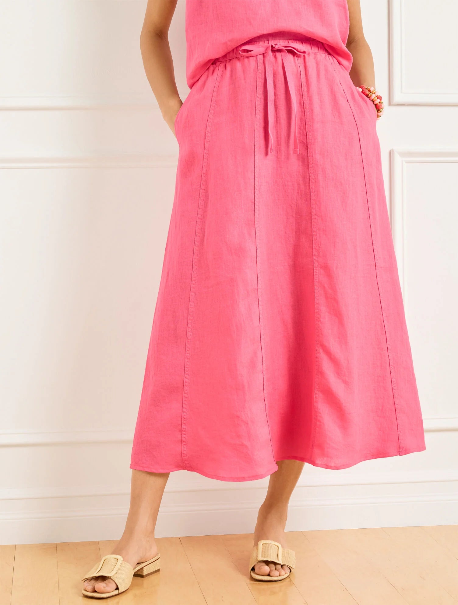 Our forever-flattering fit & flare skirt is elevated with an adjustable drawstring waist. Crafted from airy linen with on-seam pockets. An effortless essential. Just add your favorite top and strappy sandals.
