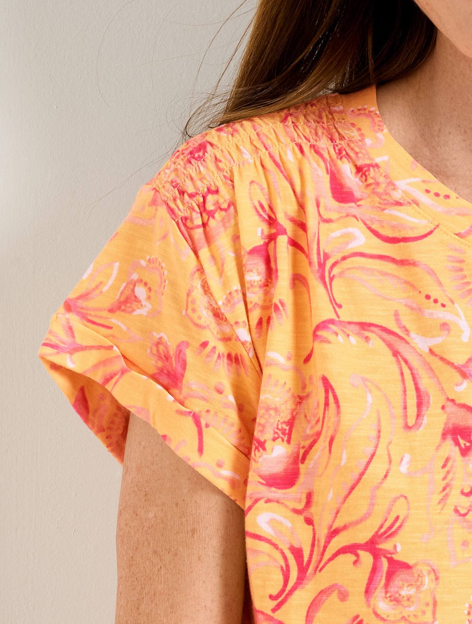 Pretty smocking at the shoulders adds a feminine touch to our much-loved tee. In a jacobean fantasia print with a classic crewneck. The perfect addition to your spring and summer wardrobe.