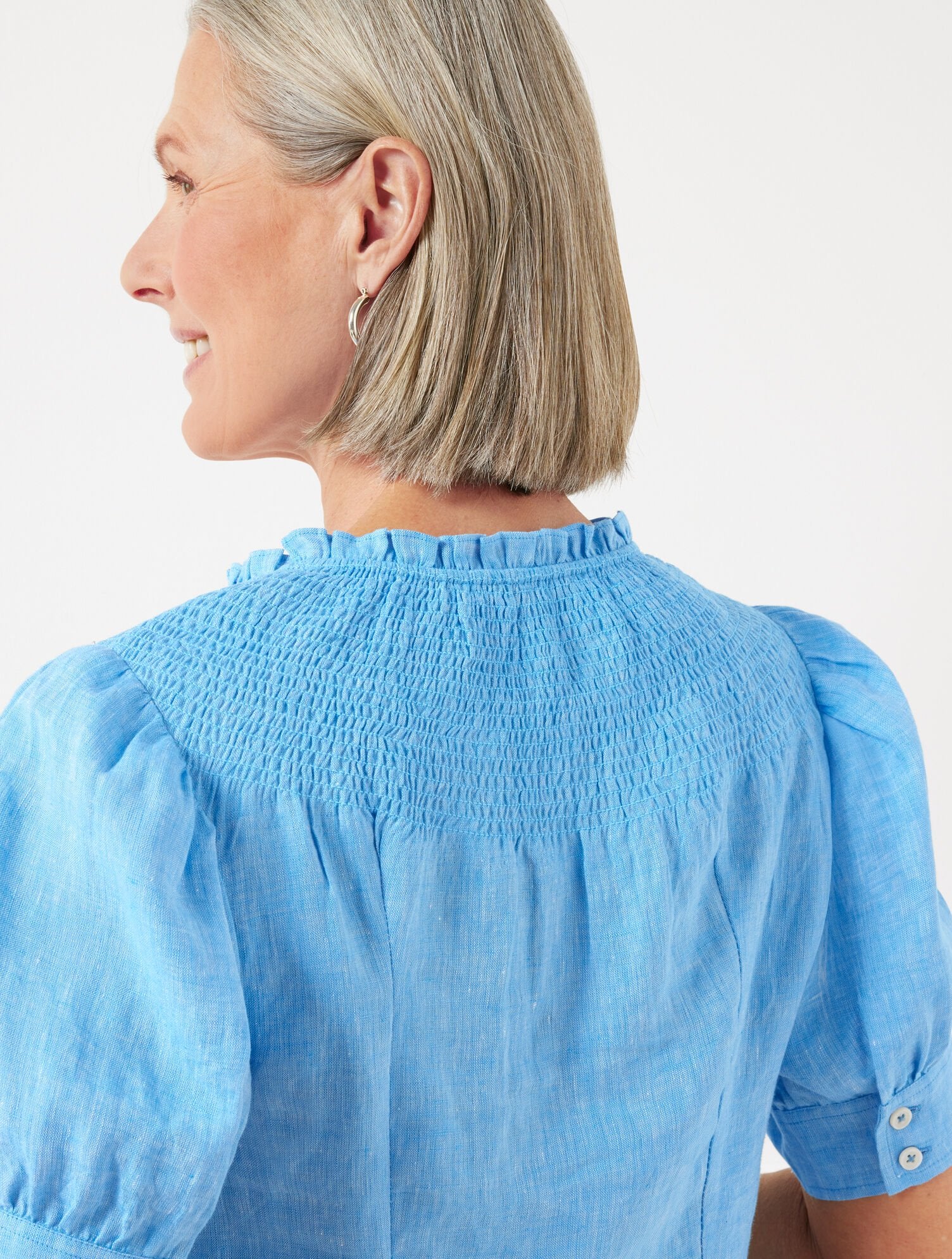 Sweet smocking at the neckline frames our effortless top. Crafted from airy, cross dye linen. Ready for your sunny day plans.