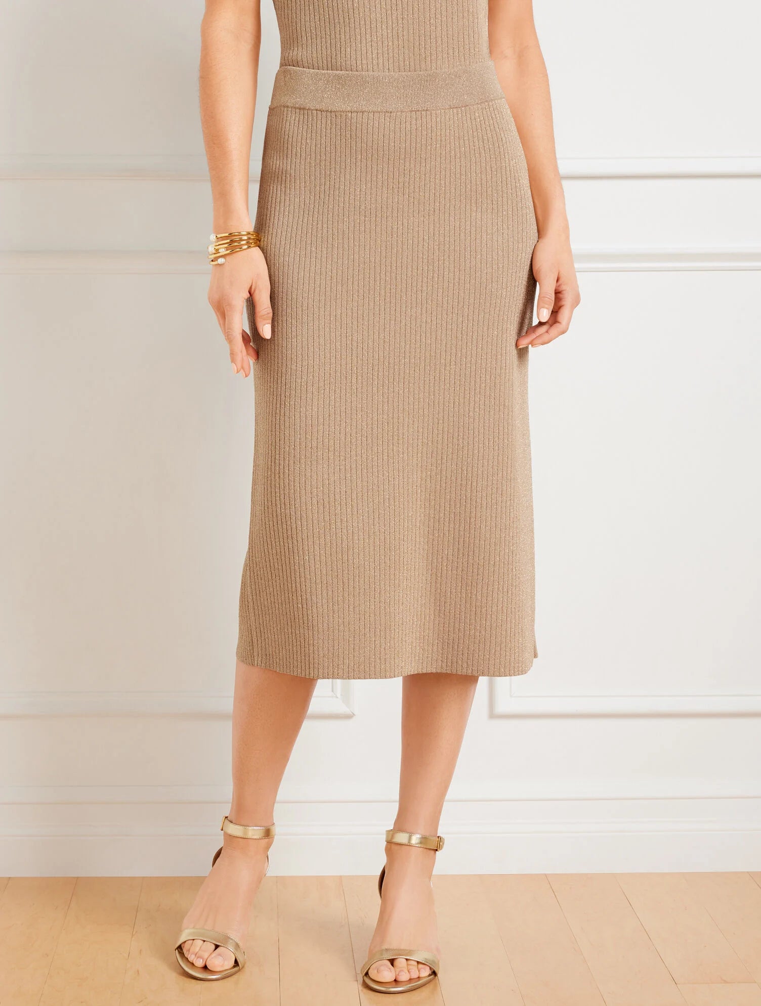 Classic ribbing adds a soft texture to this figure-flattering midi skirt. Crafted from supersoft yarns with a hint of metallic threads and effortless pull-on styling.