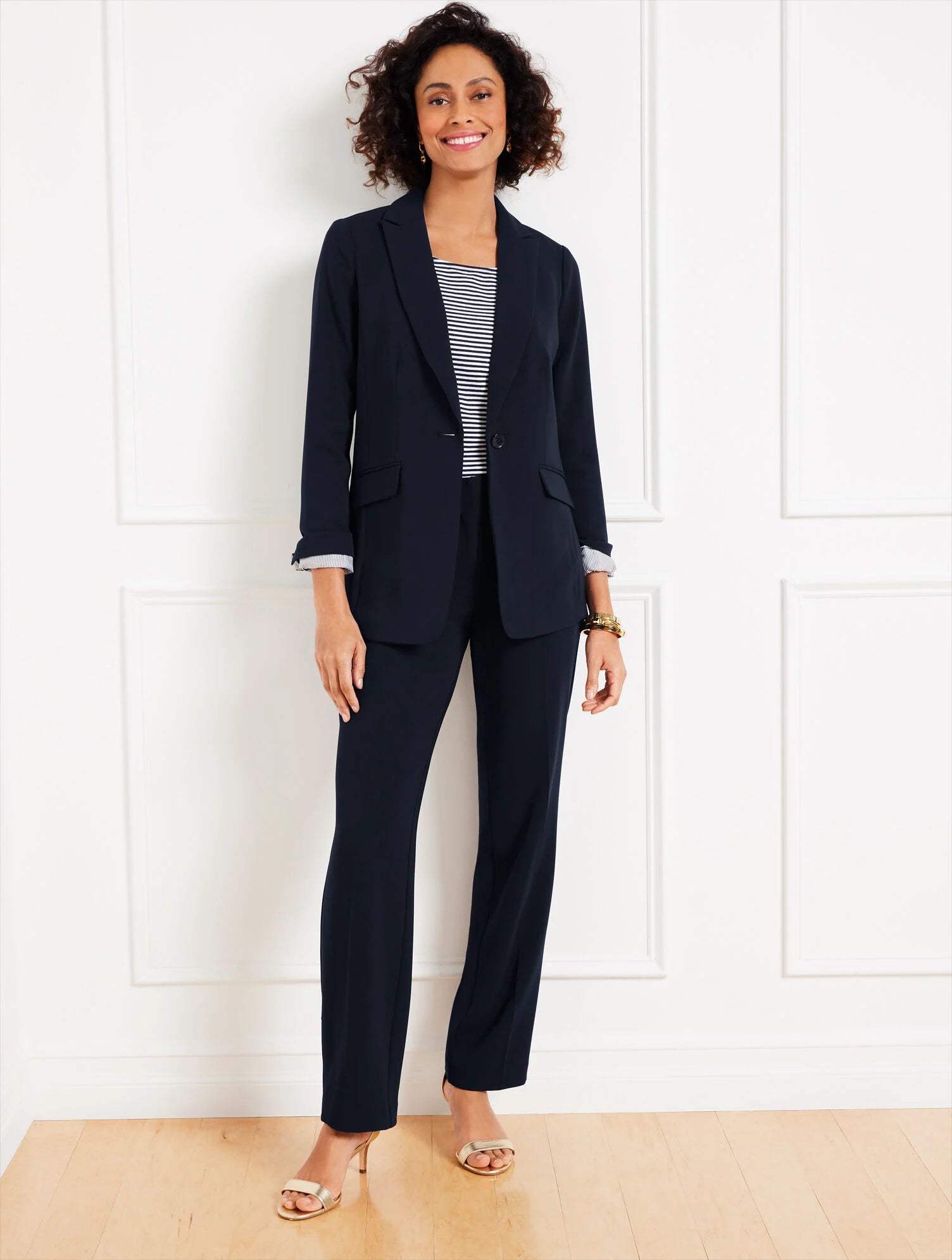 Effortlessly chic. Soft and breathable. Supremely comfortable. With a luster and feel that resembles silk. Machine washable and perfect for travel. Our flattering straight leg pants are just right for work and play. Easy-to-pack, easy care. Simple elegance in lightweight fabric with a sophisticated fit.