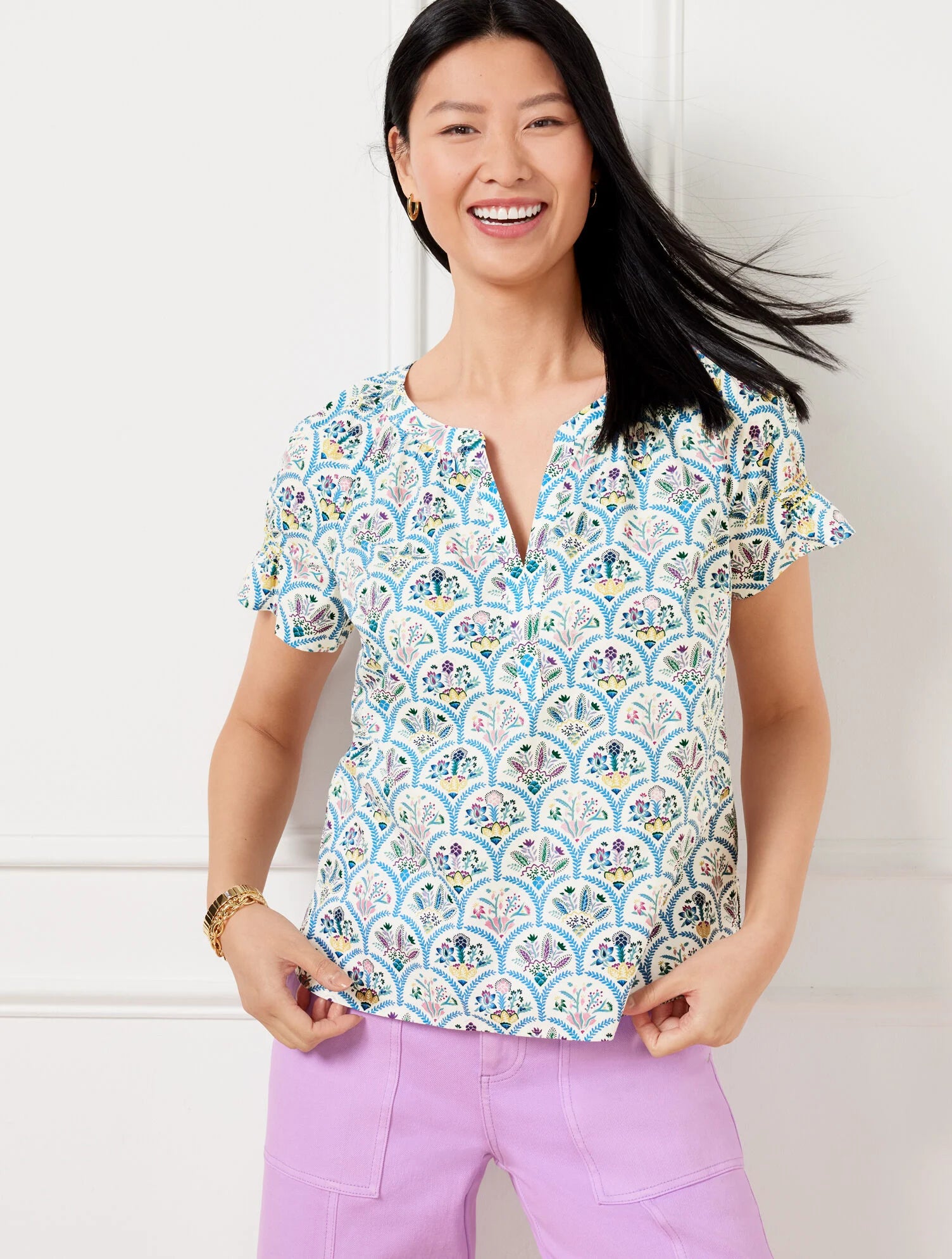 Our oh-so-feminine popover top in a scalloped floral print with a flattering split neck. Perfect for your warm-weather closet.