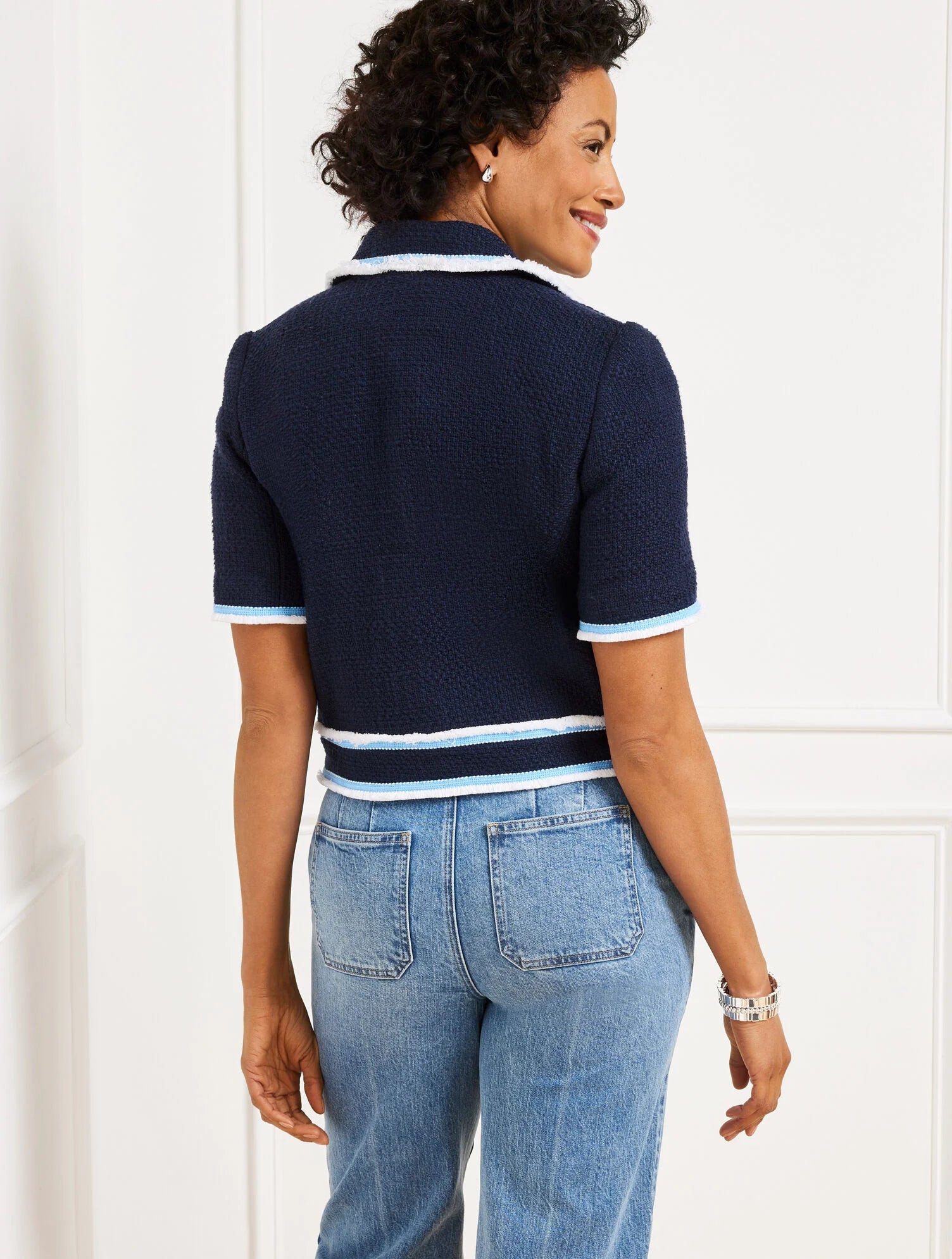 Our short sleeve jacket in richly textured tweed features playful fringe details and chic chest pockets. Ready to pull together your favorite work-to-weekend looks.