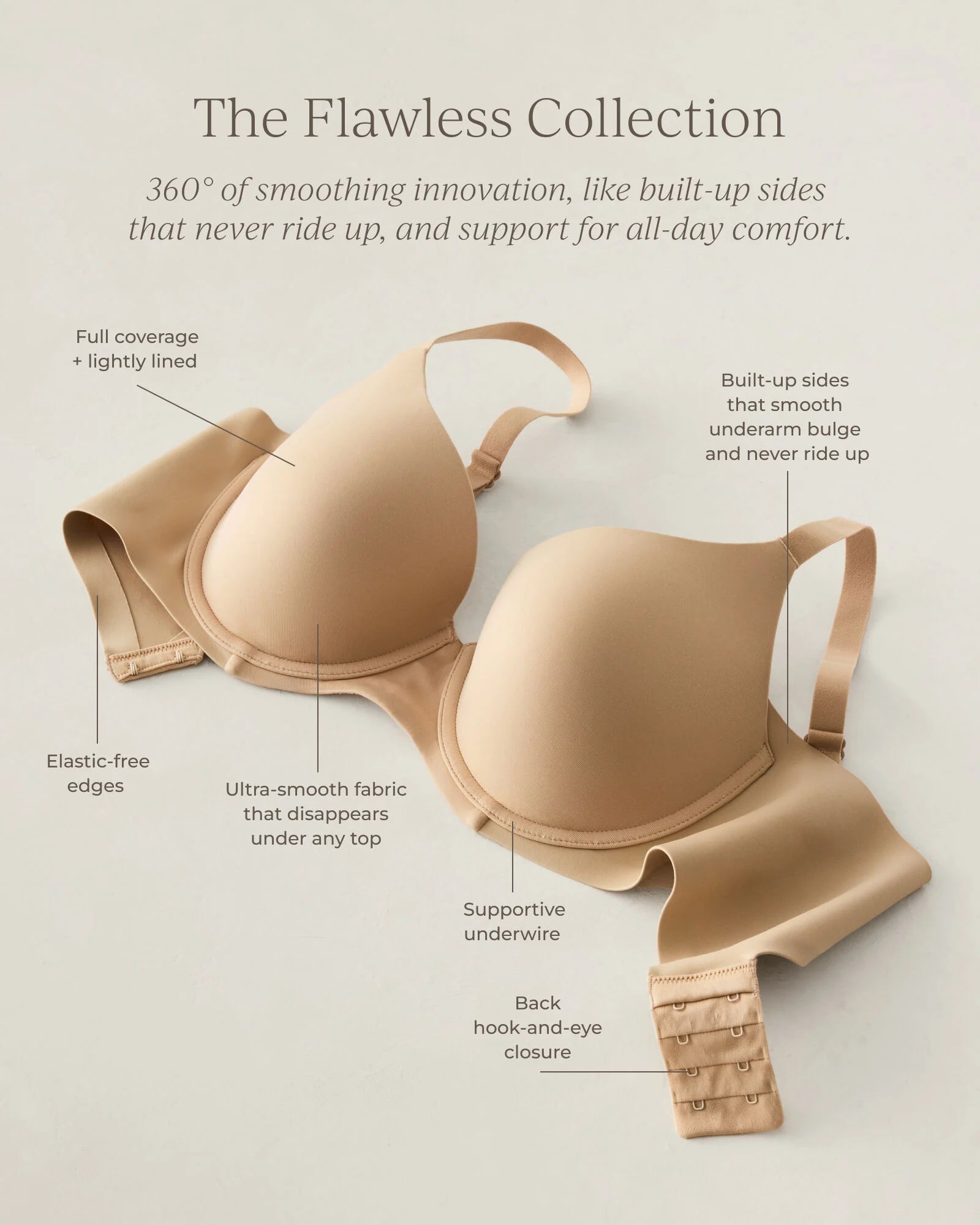 You’ve never experienced a smoothing bra like this. Its full-coverage design offers 360 degrees of smoothing innovation and support for all-day comfort, in an ultra-smooth fabric that disappears under any top. Plus: the elastic-free edges and built-up sides instantly smooth underarm bulge and won’t ride up.