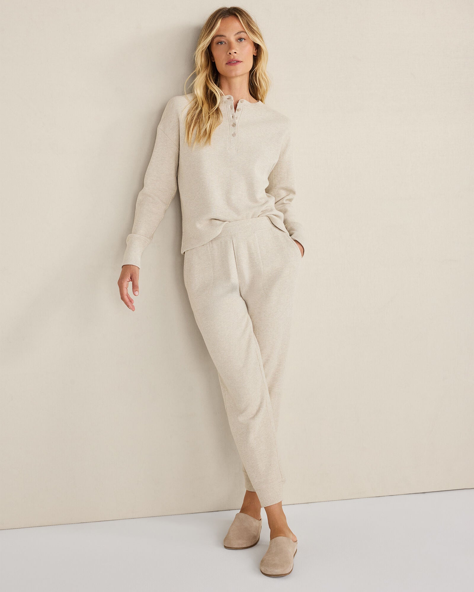 A must-have layer for summer, in an irresistibly soft waffle knit fabric. Made from 100% organically grown cotton, this long sleeve henley features a classic button front and relaxed silhouette. Wear it with the matching joggers for a complete head-to-toe look.