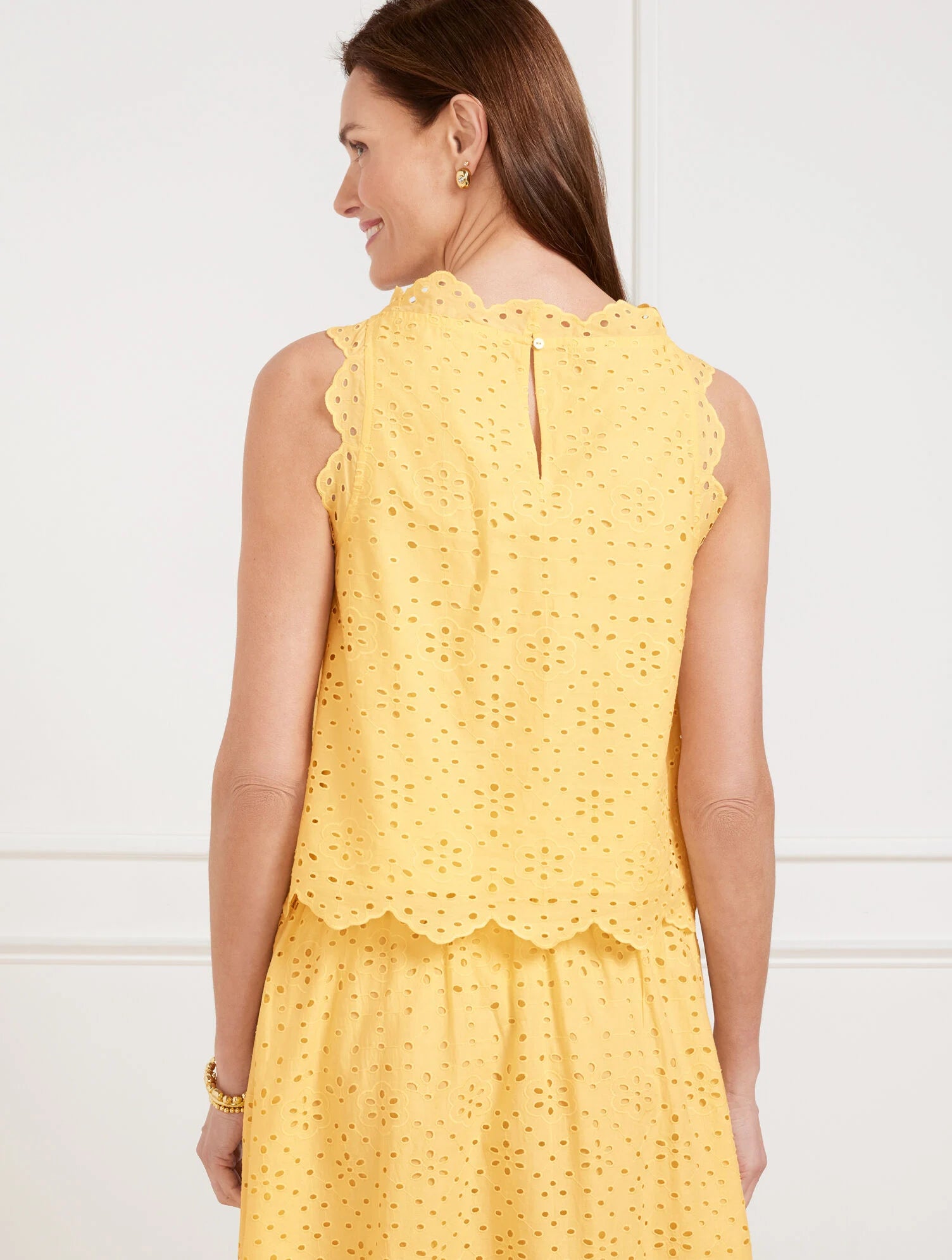 Embroidered floral eyelets accent our ultra-versatile shell. Features a feminine scallop hem. Short silhouette pairs perfectly with your favorite high waist shorts and skirts.