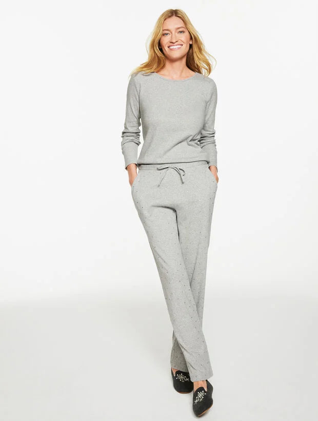 Our essential matching pajama set. Features a solid jewel neck tee and glitter dot printed, matching bottoms with an elastic drawstring waist and side pockets. Crafted from soft cotton for maximum comfort while you sleep. Sweet dreams, guaranteed.