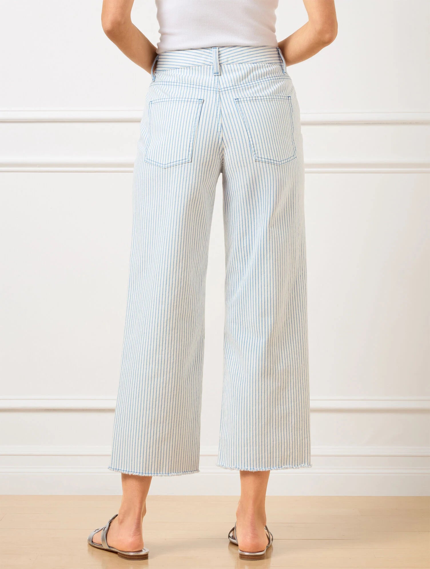Subtle distressing at the cropped hem adds a lively touch to our relaxed wide leg jeans. Ultra-flattering high waist with five-pocket styling. Ready to top your favorites list.