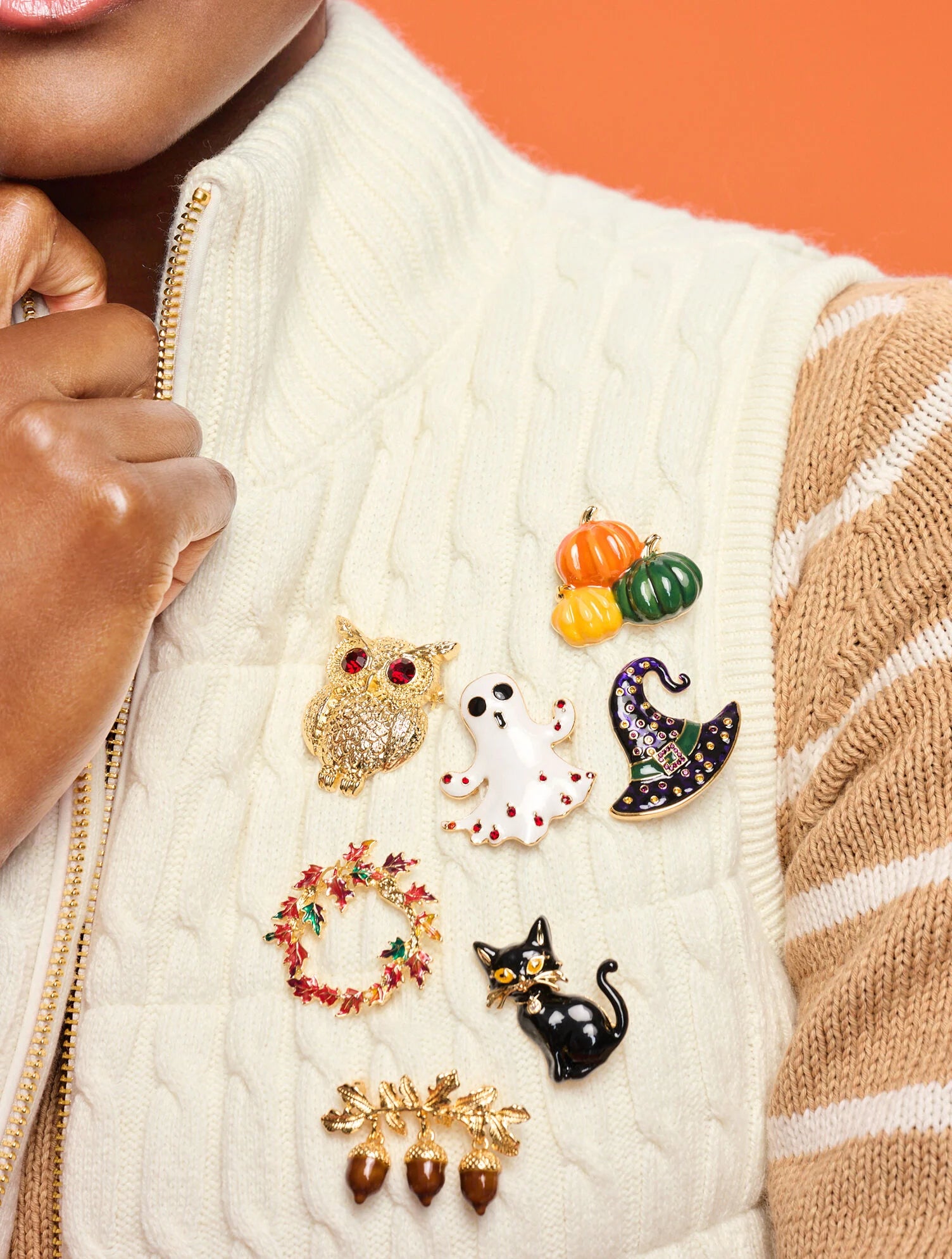 Our beautifully bewitching hat brooch. Detailed with shimmery light-catching stones. It’s the perfect pin for your favorite sweater.