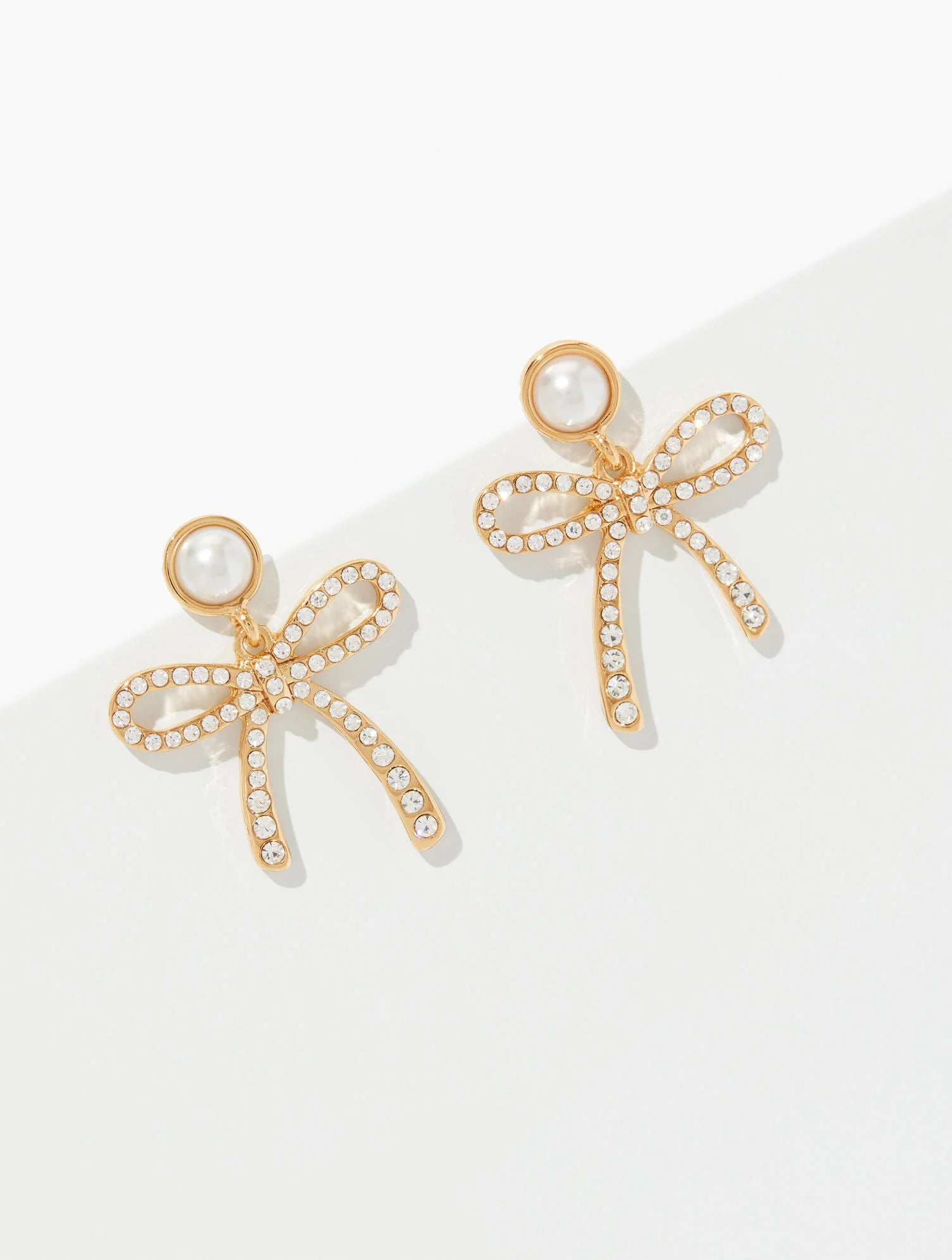 Put a glistening finish on your ensembles with our charming ribbon drop earrings. Beautifully crafted with light-catching stones and a lustrous pearl. Grab a pair for your best-dressed friends.