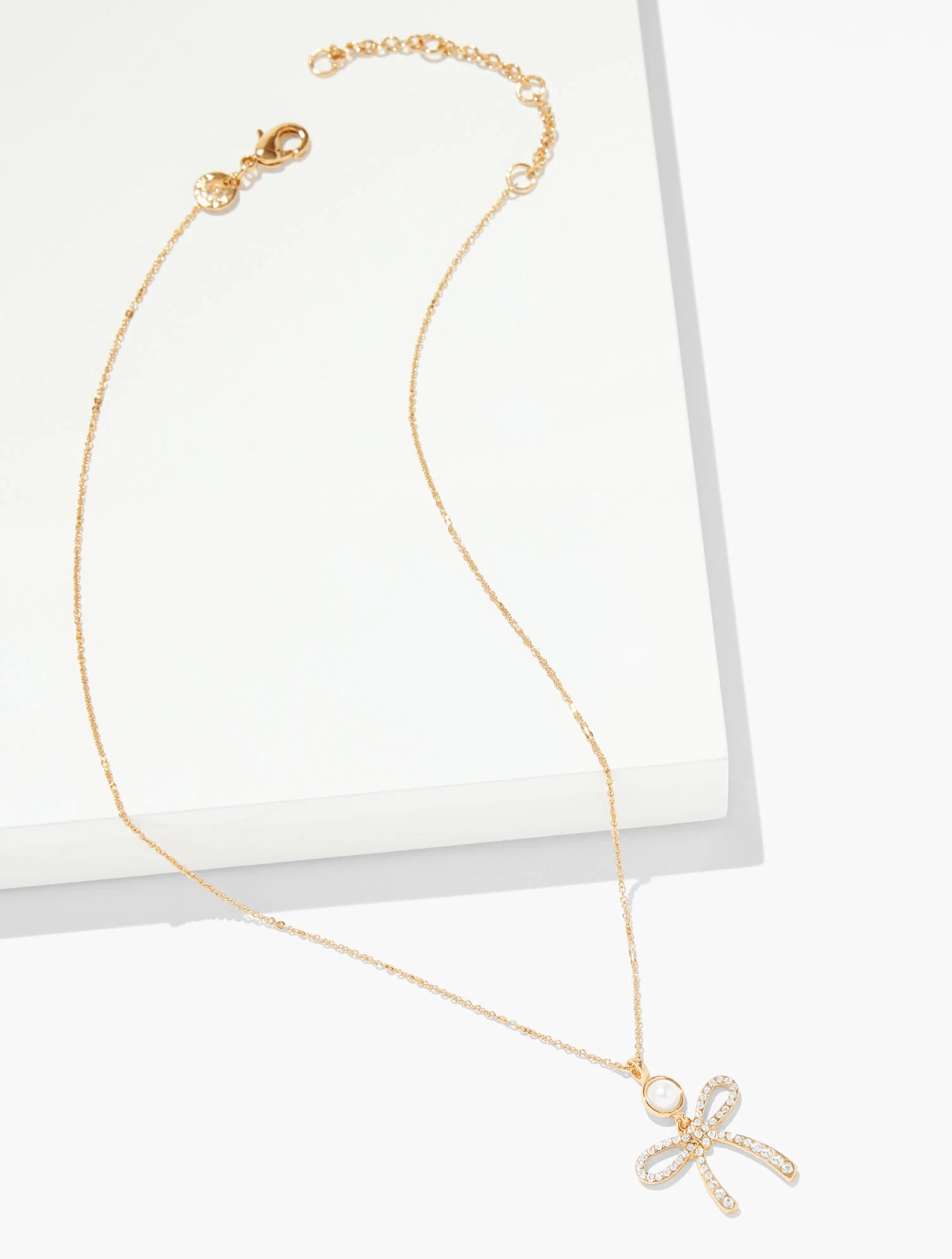Hello, pretty in pearlescent! Tie up your favorite ensembles with this dainty ribbon bow necklace. Detailed with a lustrous pearl.