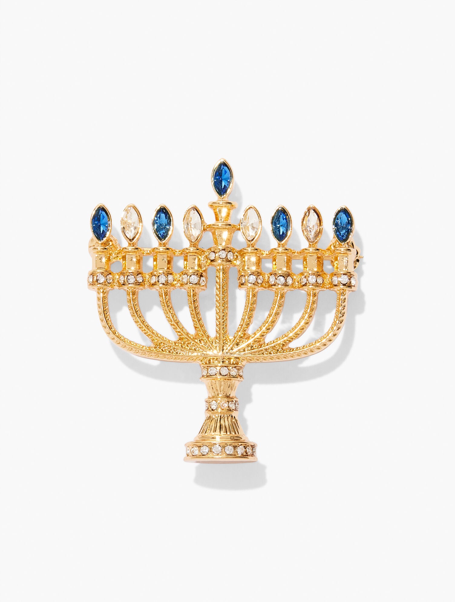 Celebrate this special time of the year with this joyous Menorah Brooch. Detailed with shimmery light-catching stones. Pin it on for an instant pop of cheer.