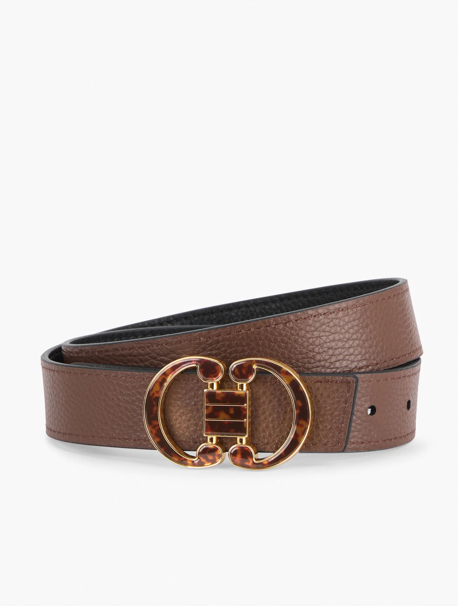 A bold tortoiseshell buckle elevates our soft leather belt. Crafted in a reversible design for multiple styling options. A luxe finishing touch.