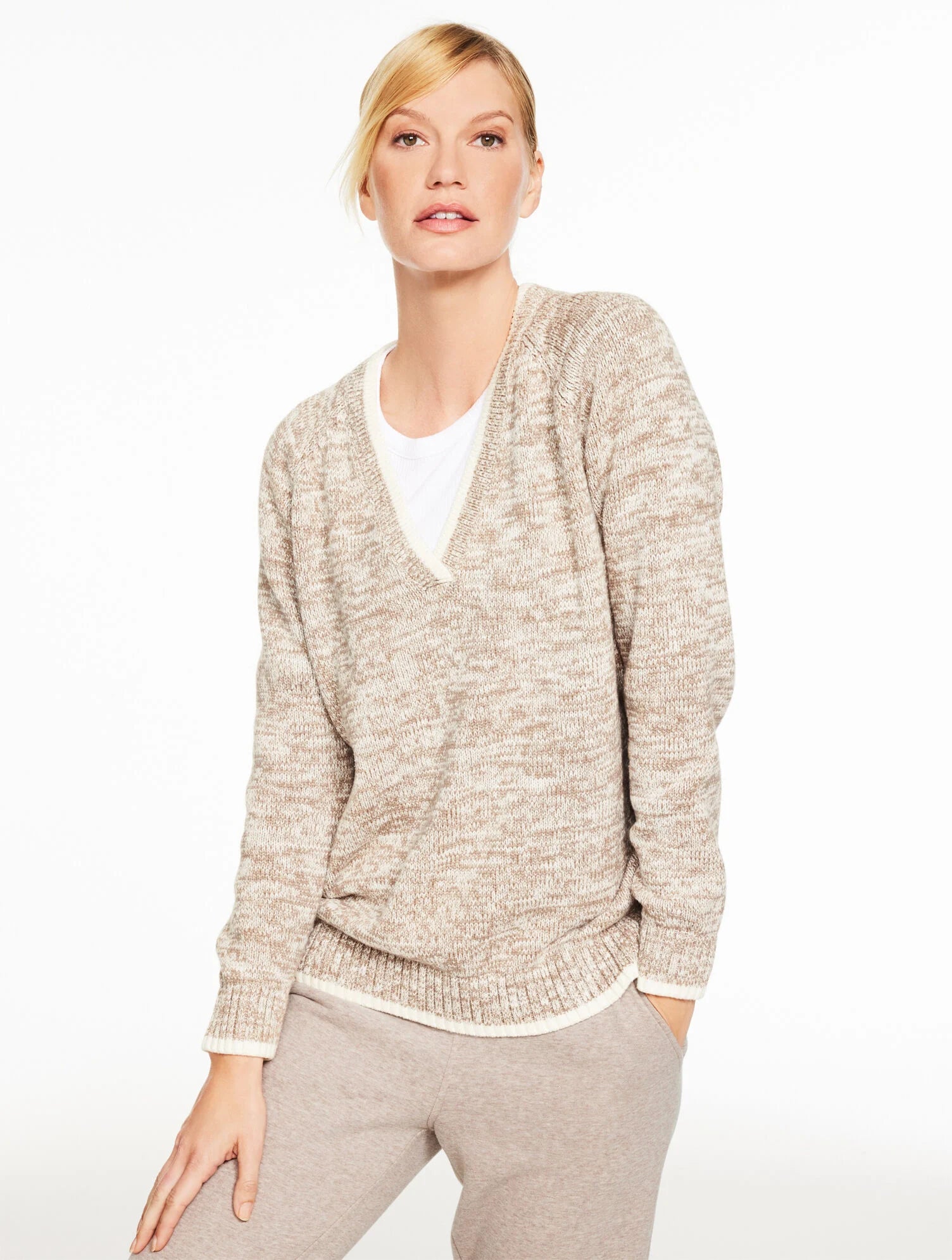 Stay warm and ready for anything in this preppy V-neck sweater. Crafted from a soft cotton blend with bold contrast details and rib knit trim.