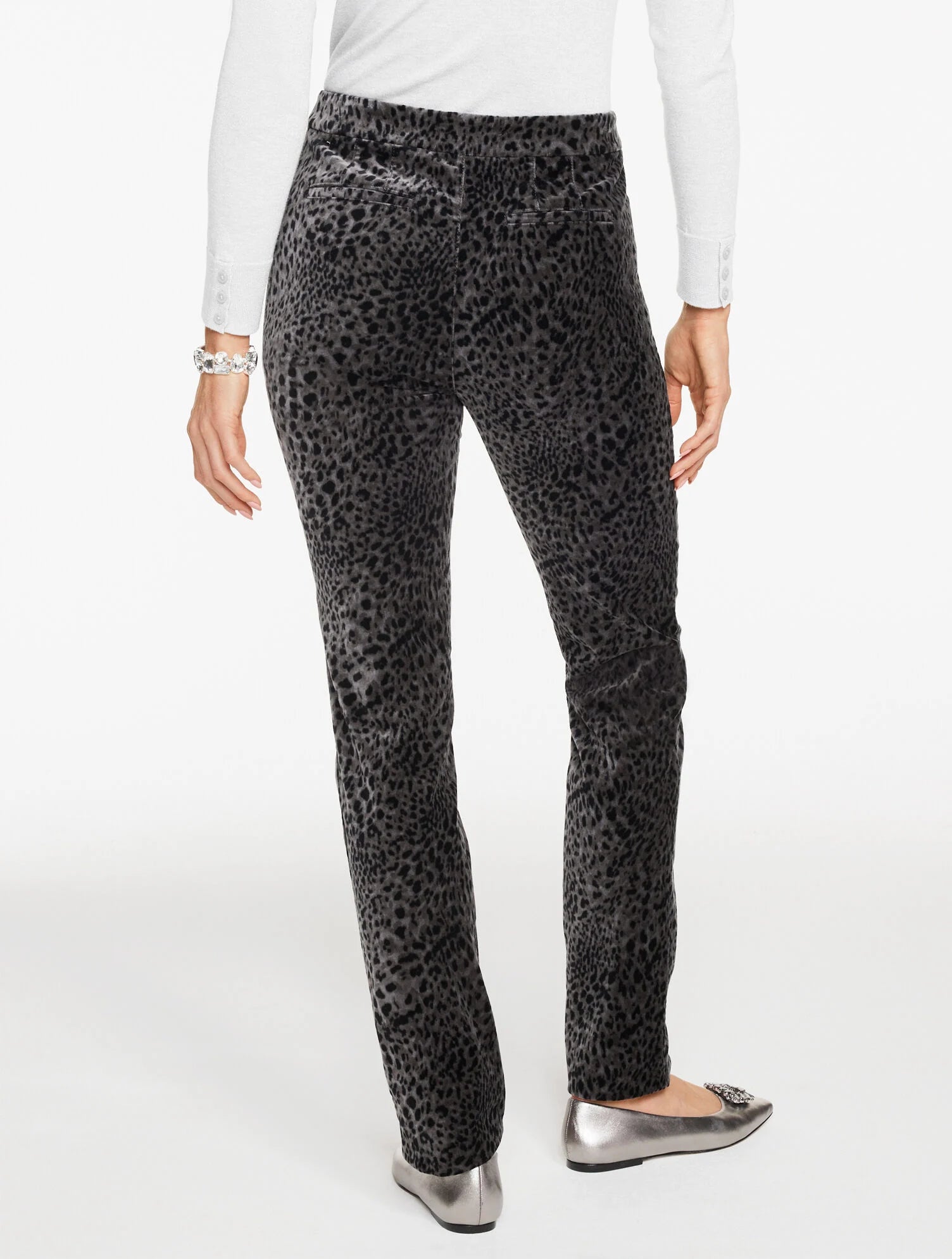 Swirly leopard print make a fierce statement on our soft-to-the-touch velveteen pants. Crafted with a comfortable high waist and five-pocket styling.