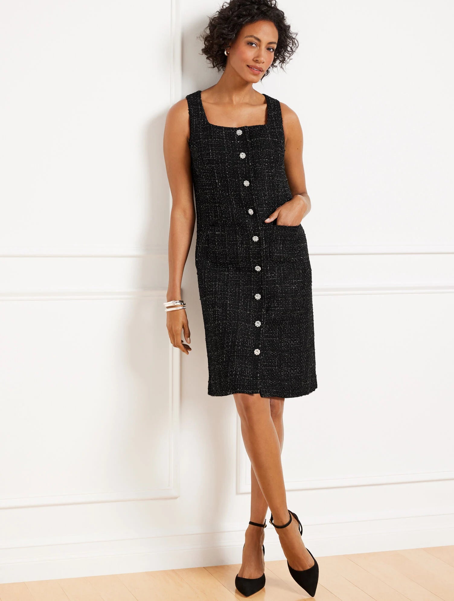 Our always-flattering shift dress. Made with an elegant tweed finish with sparkling metallic threads. Features easy button front closures. Sleeveless design looks fabulous under your favorite coat or jacket.