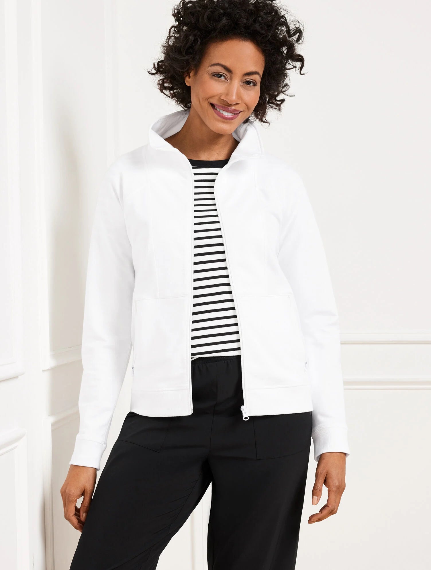 Our sporty yet chic lightweight jacket is ready for anything this season. Features an easy zip front closure and convenient zip pockets. Crafted from French terry fabric for heaven-on-earth softness. With SunWell UPF 50+ protection. It’s the perfect layer for casual days on the go.