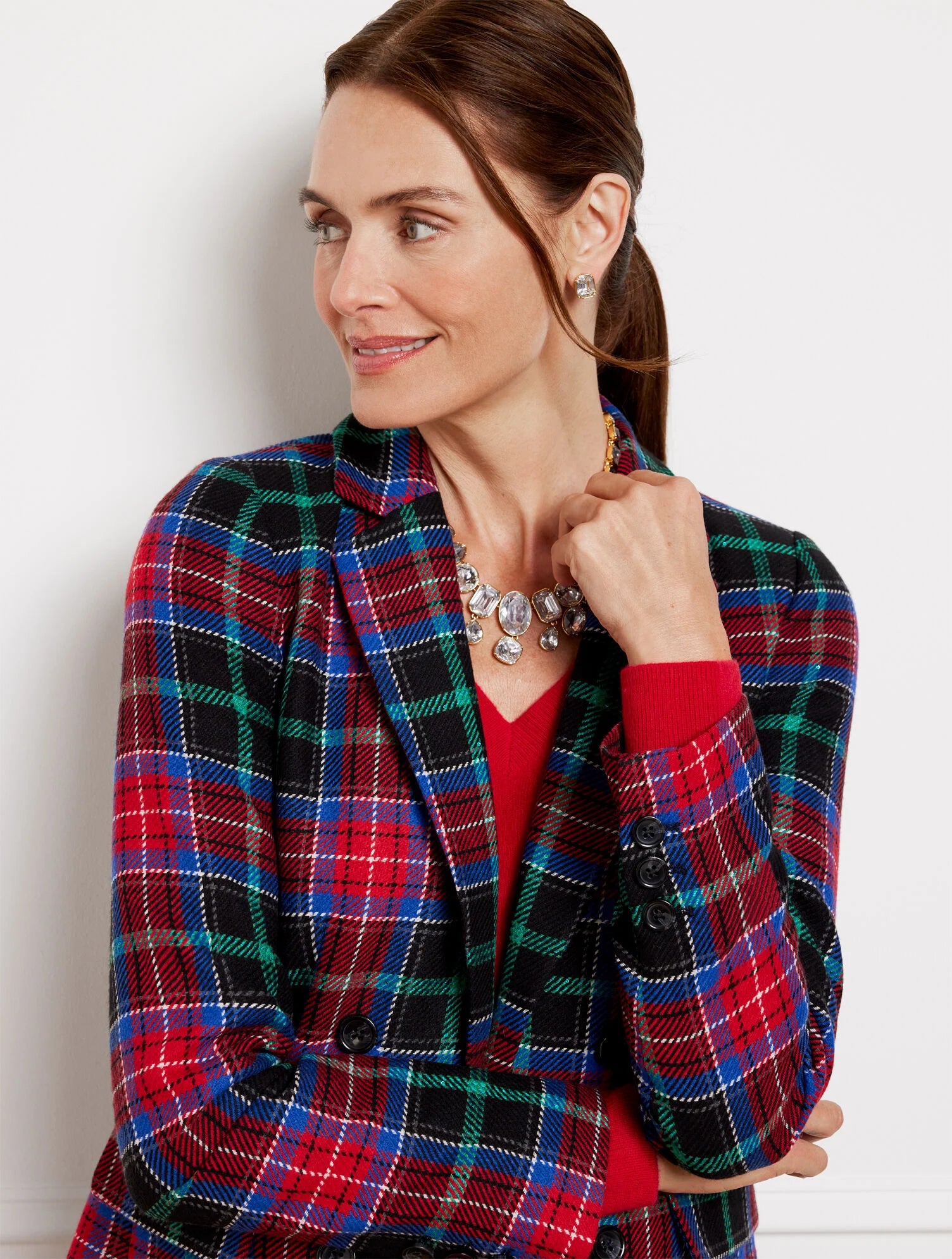 Bring easy elegance to your ensembles with this beautifully crafted, open front jacket in a season-ready plaid pattern. Complete with flap front pockets.