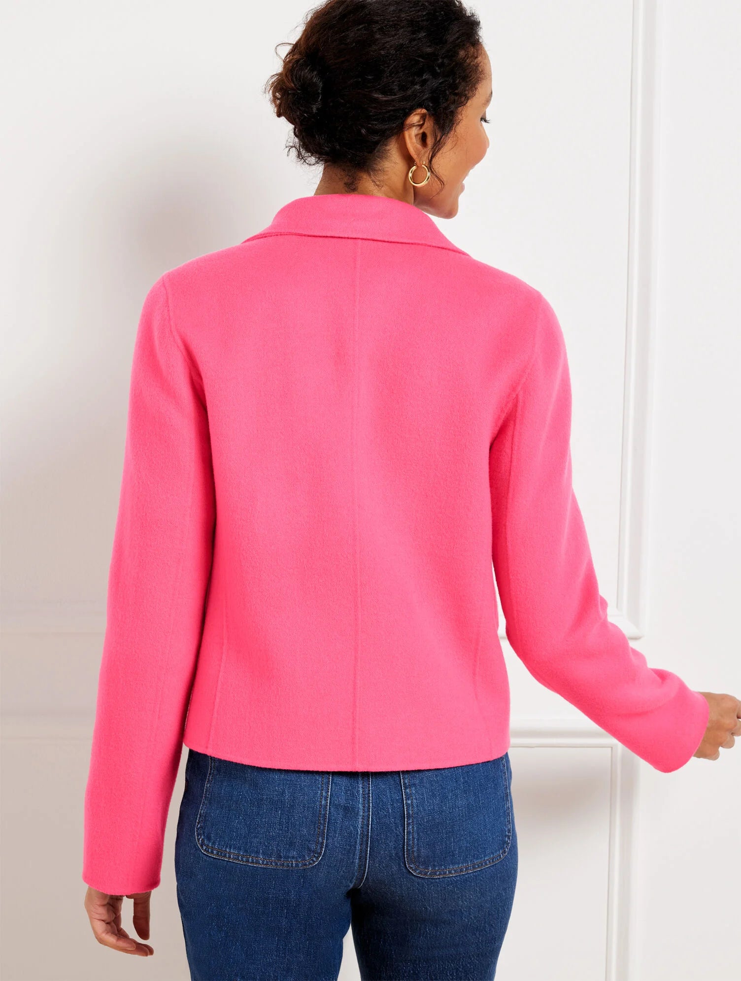 Our cozy, double face wool blend jacket is the perfect outer layer. Crafted in a cropped silhouette with an easy button front closure. Unlined interior is just-right for layering season.