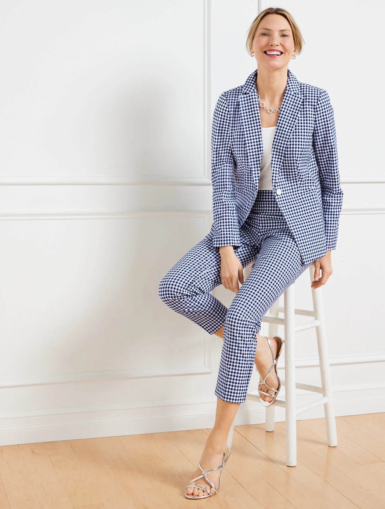Our desk-to-dinner, single-button blazer in crisp gingham. Crafted from breathable cotton with a hint of stretch. Perfect from morning meetings to evening events.