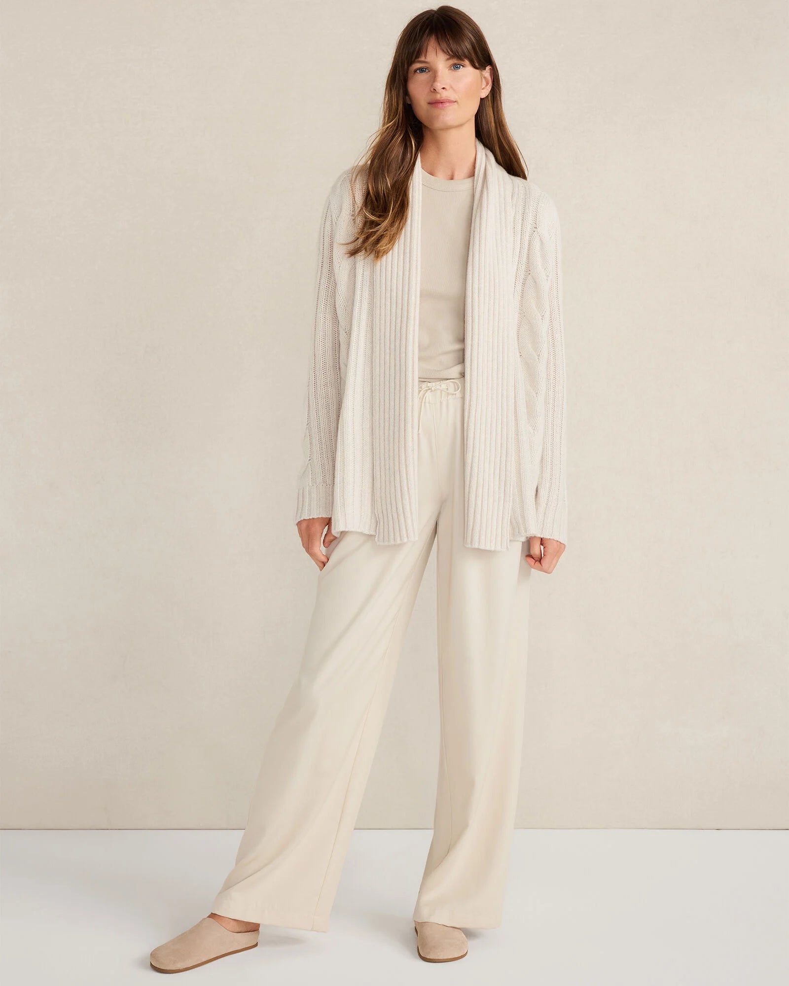 Layer on the lavish comfort of 100% cashmere. This relaxed, open front cardigan features a chunky cable knit and delightfully-soft feel. Style it with a cotton tee and your favorite lounge pants.
