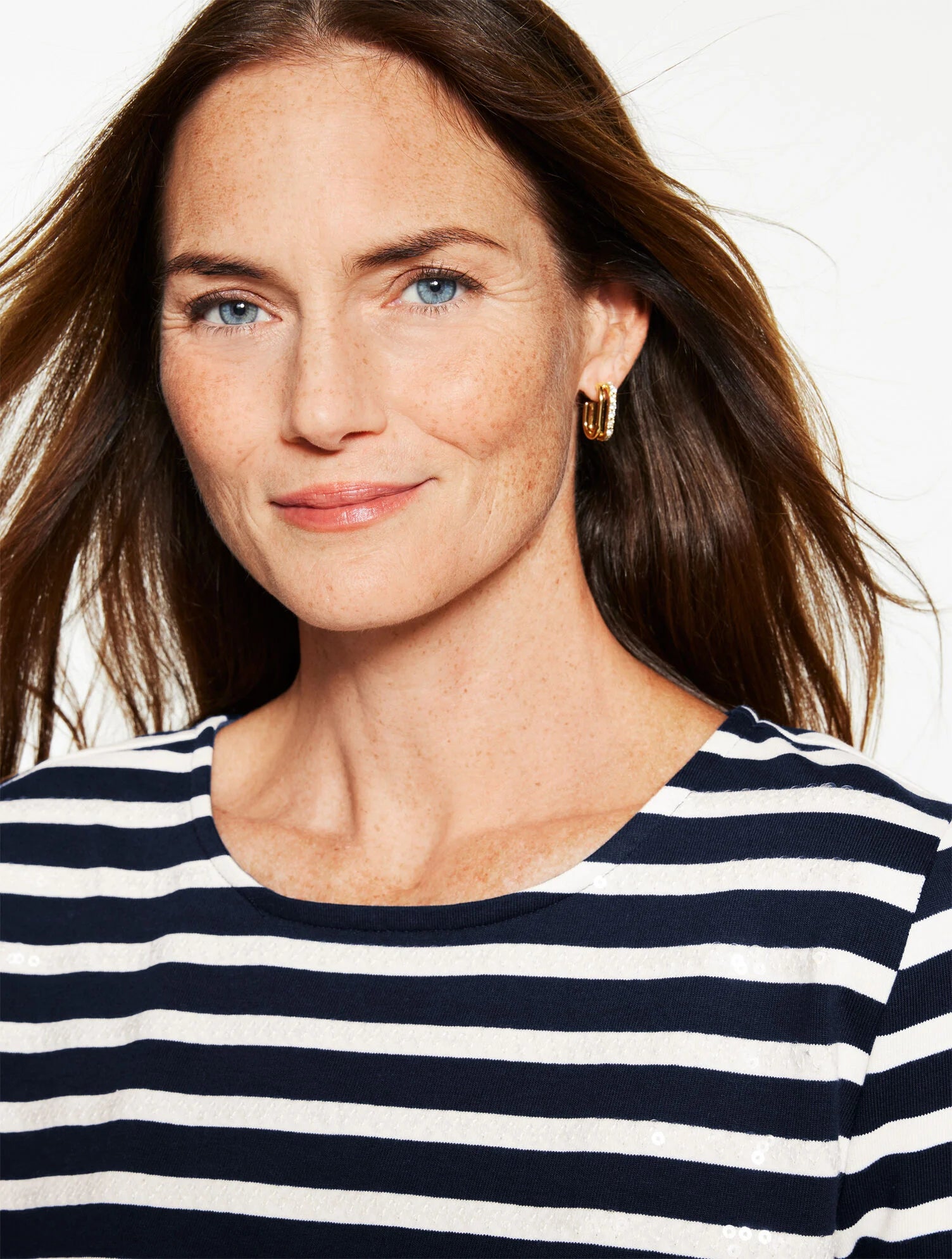 Light up any room in this effortlessly chic crewneck t-shirt. Crafted with lustrous sequin stripes. For countless parties and happy occasions.