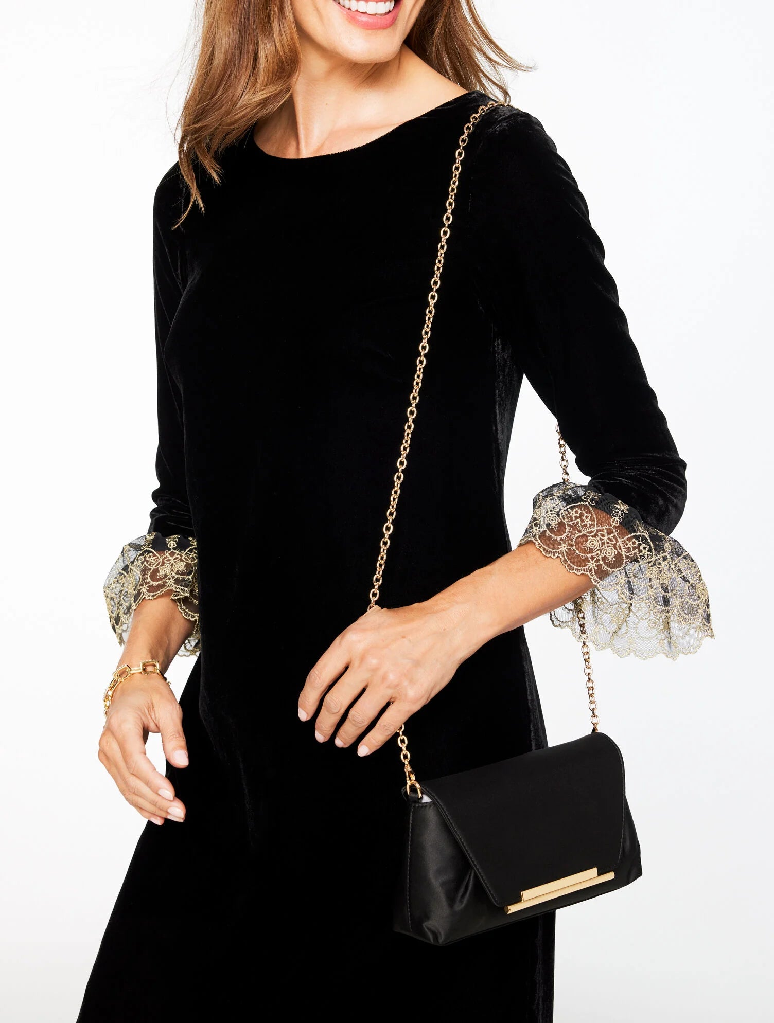 Accent your outfits with our evening-ready satin bag. The perfect grab-and-go accessory for carrying just the essentials. Crafted with a modern flap top and an adjustable chain strap. Wear it as a chic purse or a hands-free crossbody.
