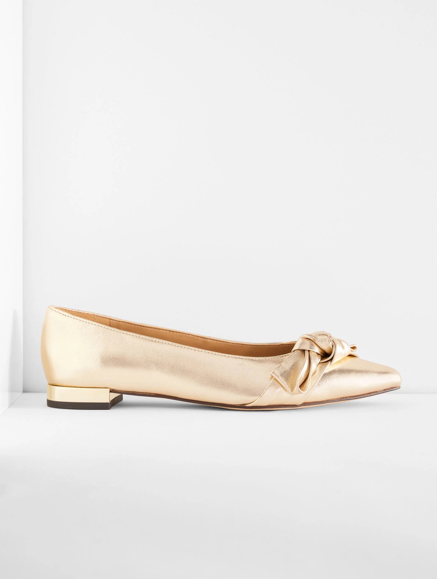 Everyday shoes, elevated! Our elegant pointy-toe flats in luxe metallic leather with a knotted bow at the vamp. Memory foam footbed feels great all day. Heel and arch padding for extra comfort and support. Flexible outsole for improved stability.