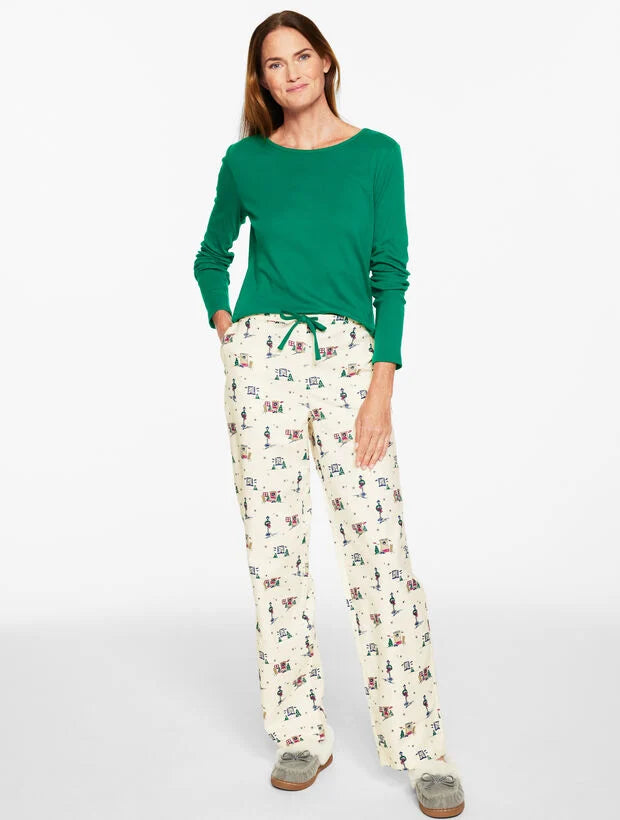 There’s no place like home for the holidays. Set the tone in our dreamy soft pajama set. Features a solid jewel neck t-shirt. Coordinating pants are crafted from cotton flannel with an elastic drawstring waist and side pockets.