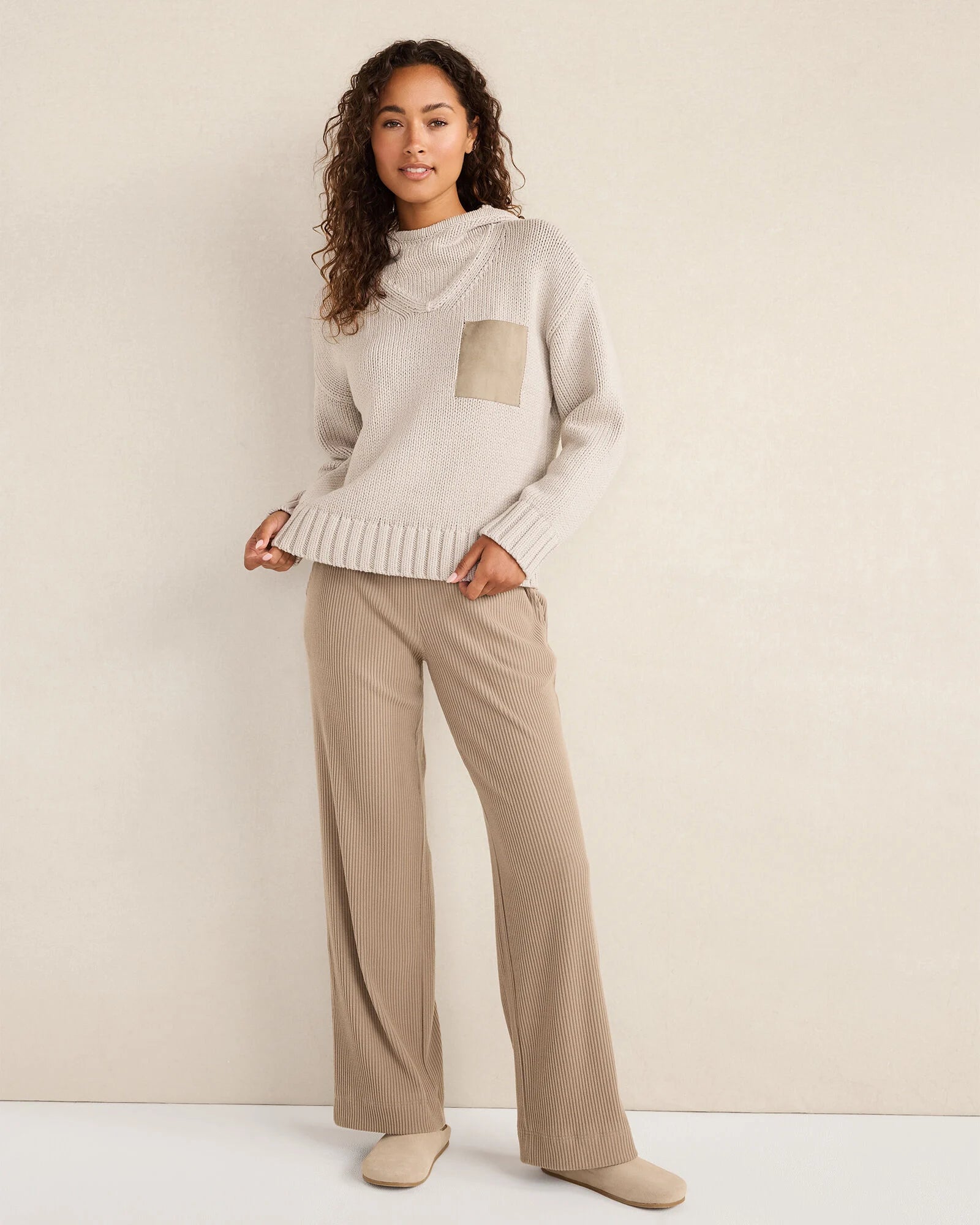 Simple, yet elevated. This pullover hoodie features a faux suede patch pocket for a hint of sophistication and added interest. Complete your look with leggings and your warmest pair of slippers.