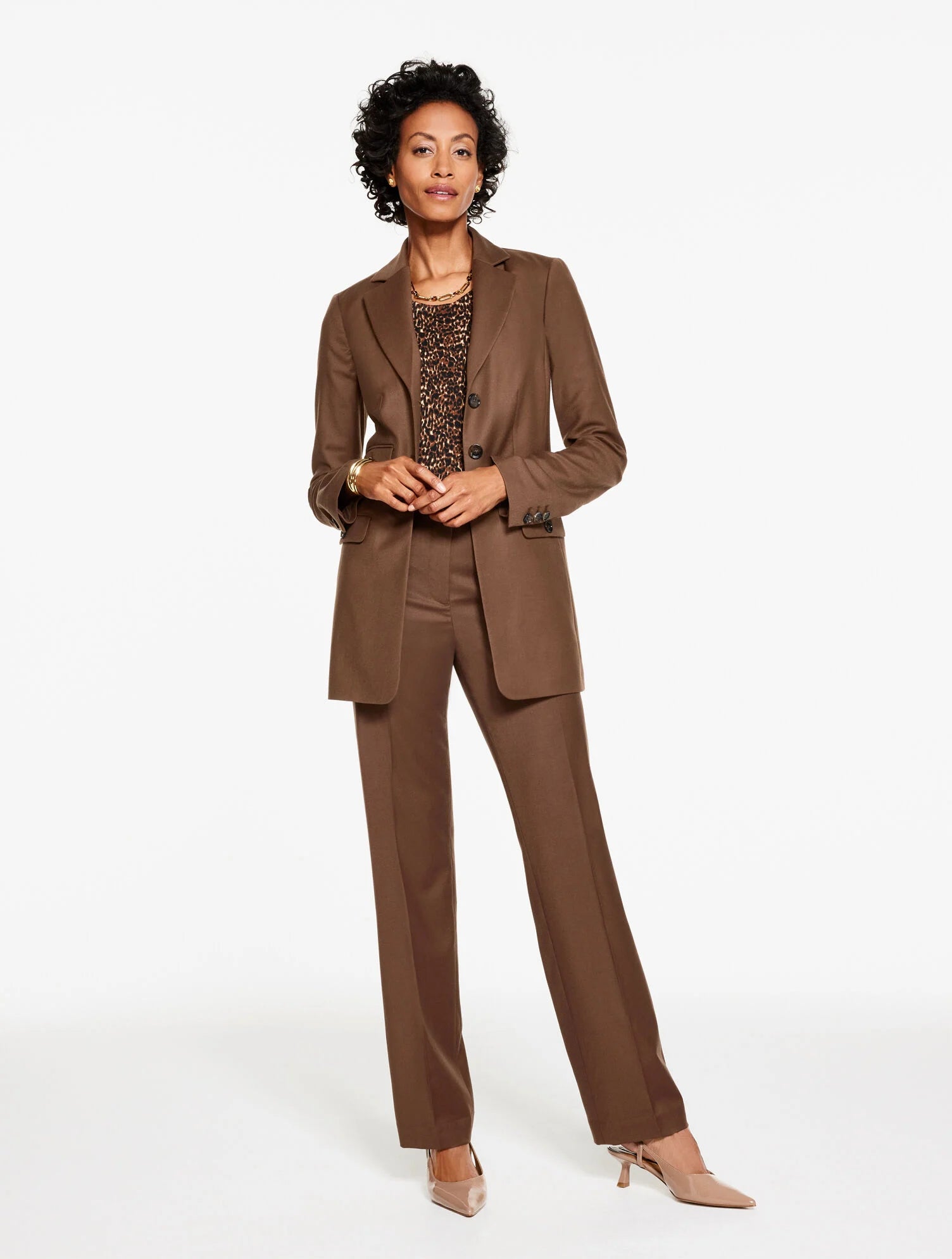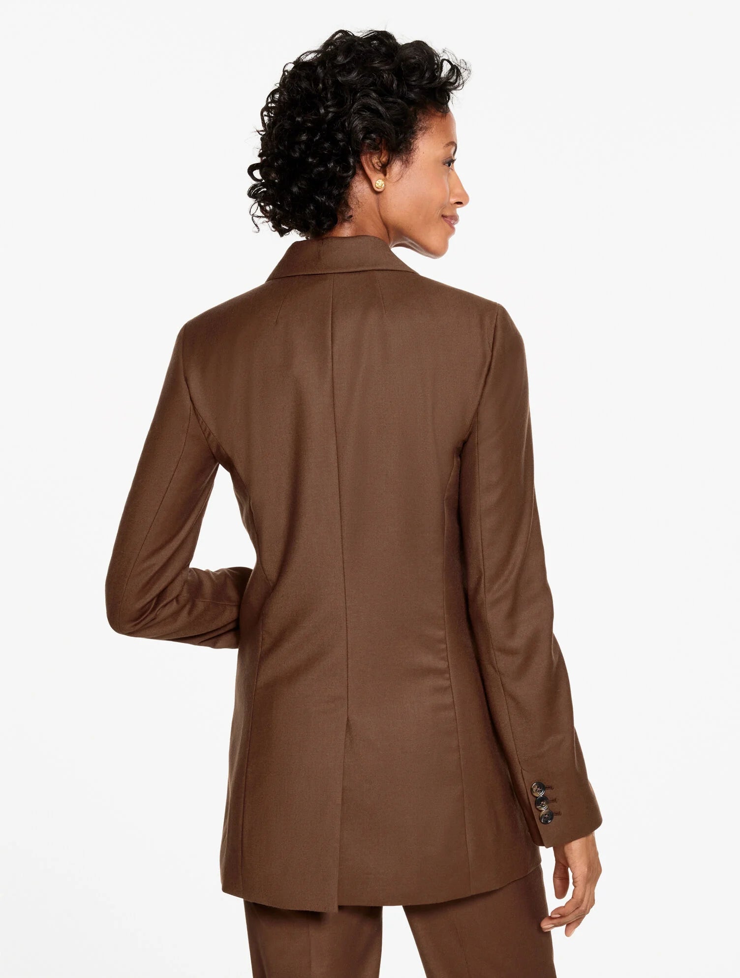 Tailored from exquisite Italian wool with a touch of stretch for the perfect fit. A fabulous addition to your work-ready closet. Go contemporary-chic in this beautifully crafted blazer. Detailed with button flap pockets. Hello, desk-to-dinner perfection.