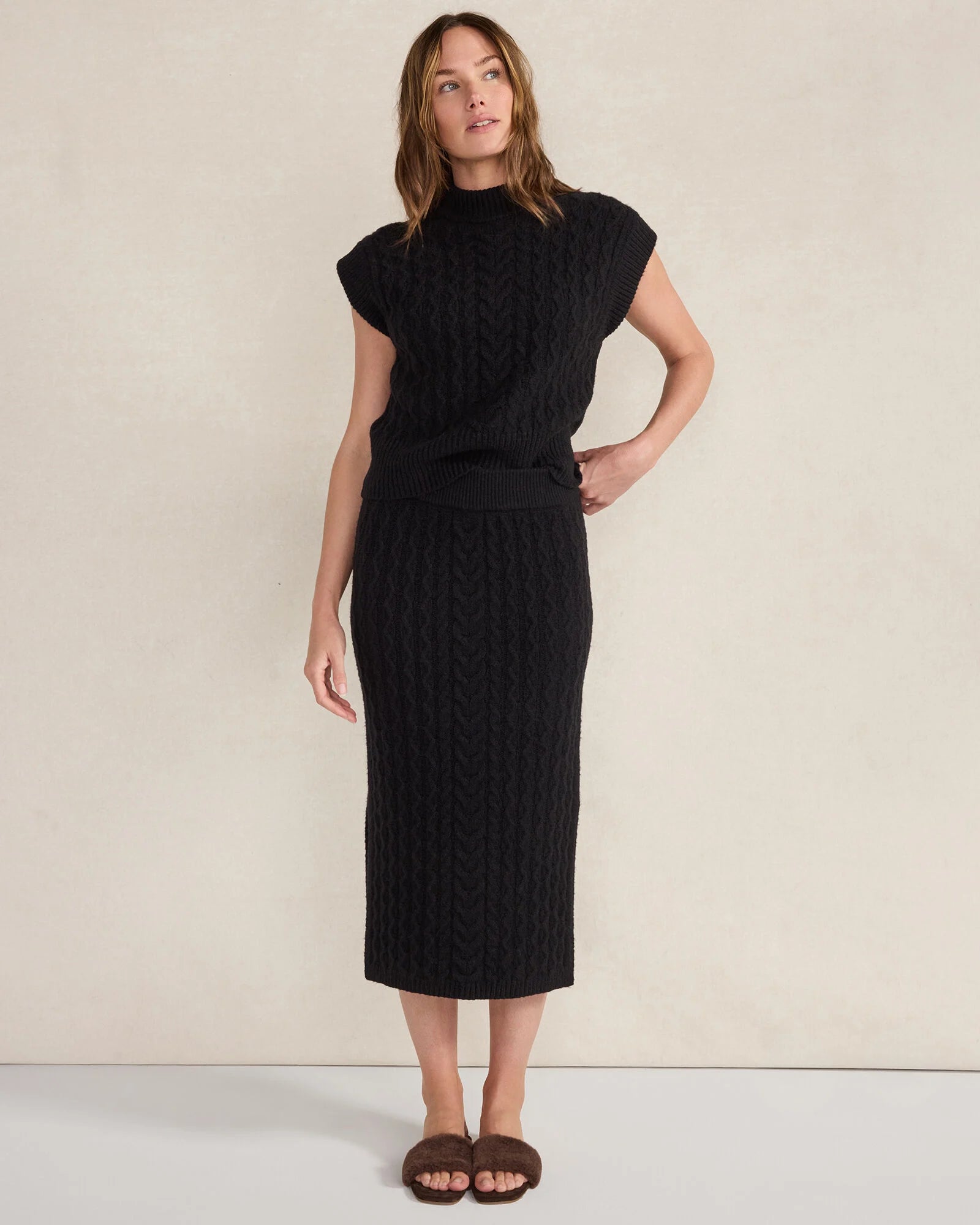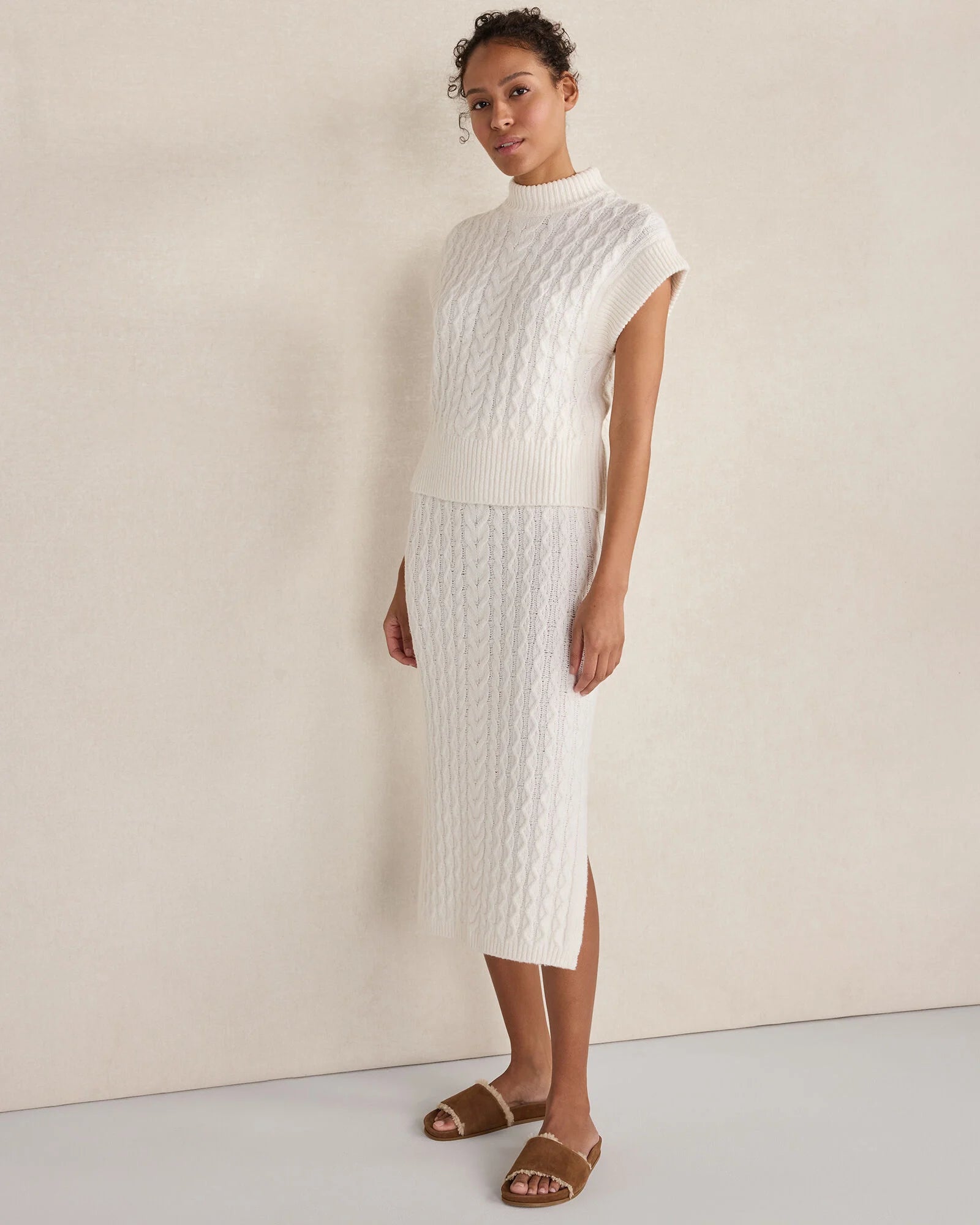 Slip into the perfect transitional midi skirt. This easy-to-wear pull-on style is woven with an organic cotton blend into a chic cable pattern. For a complete head-to-toe look, style it with the matching sweater vest in the same fabric and color.