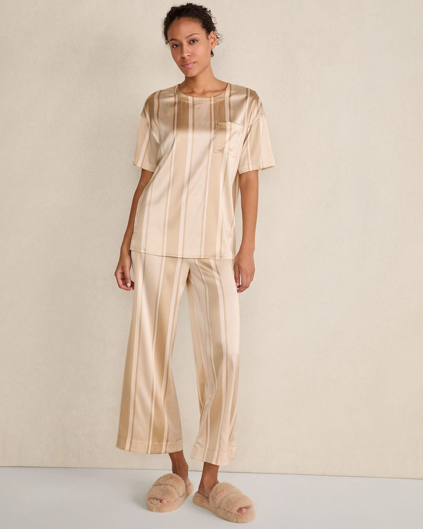 An upgrade to your average sleep tee. This short sleeve Washable Silk Drop Shoulder Tee is the most sophisticated way to say 'goodnight'. The classic crewneck silhouette and relaxed fit keep you comfortable all night long, while the stripe pattern adds a chic touch. Wear it with the matching pants for even more comfort.