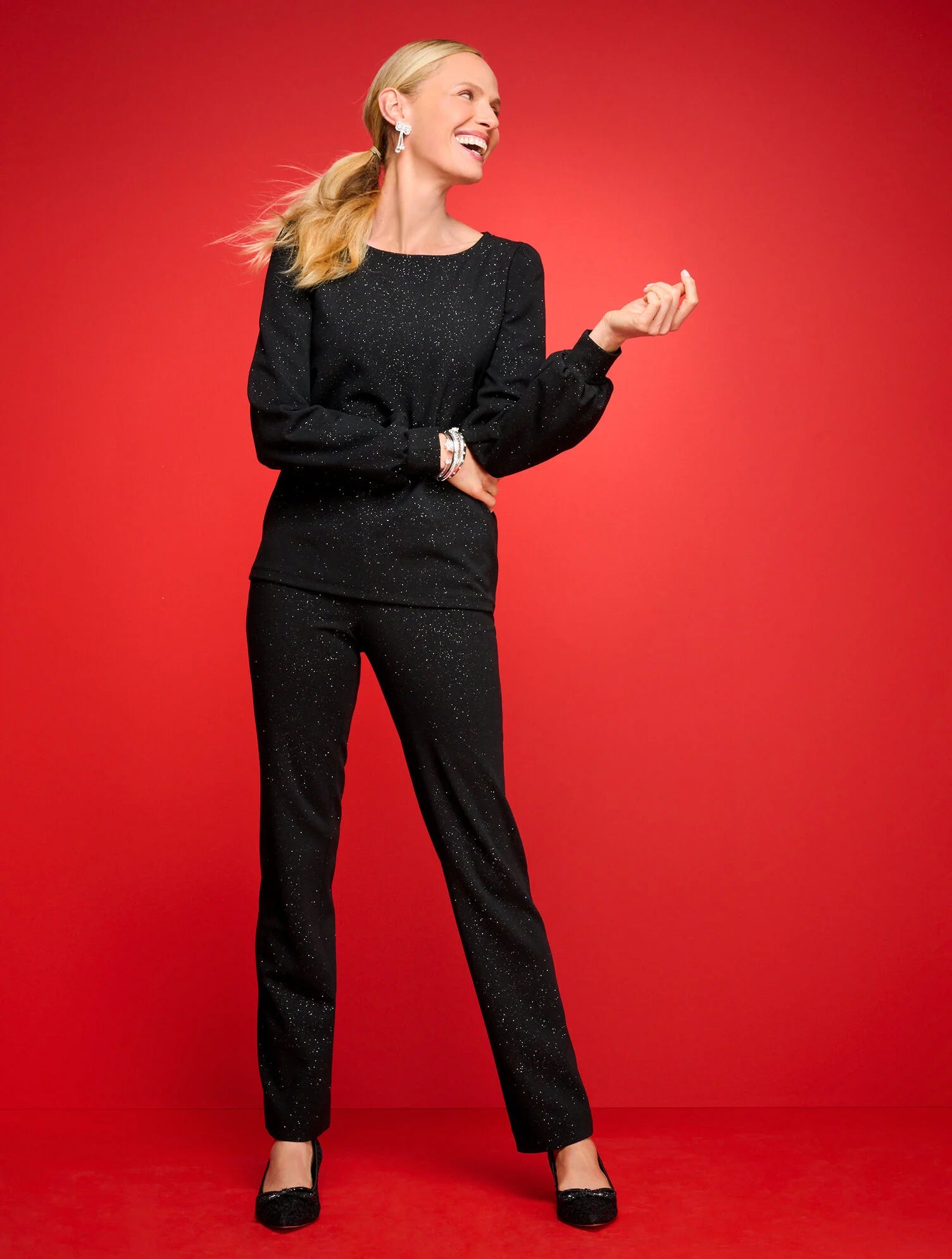 An updated take on your favorite straight leg pants. Feels-good knit fabric with elegant draping and a hint of shimmer. Perfect for your event-filled calendar.