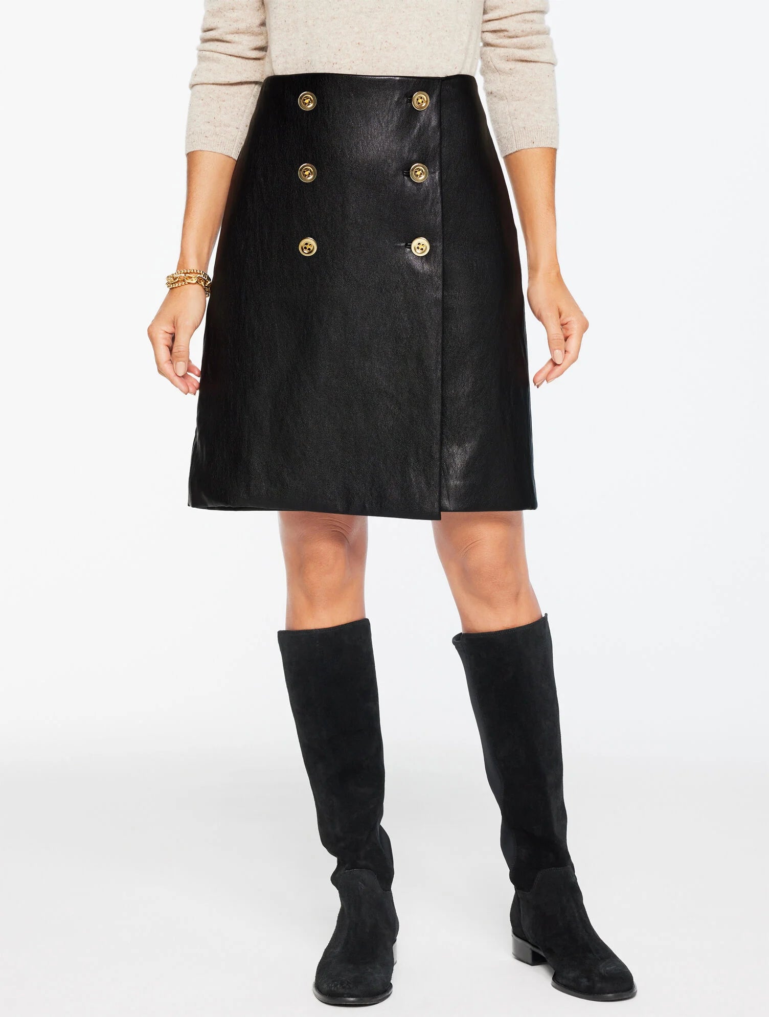 Smooth faux leather brings timeless sophistication to this A-line skirt. Crafted with chic button details. Beautifully feminine. Forever stylish. A desk-to-dinner favorite.