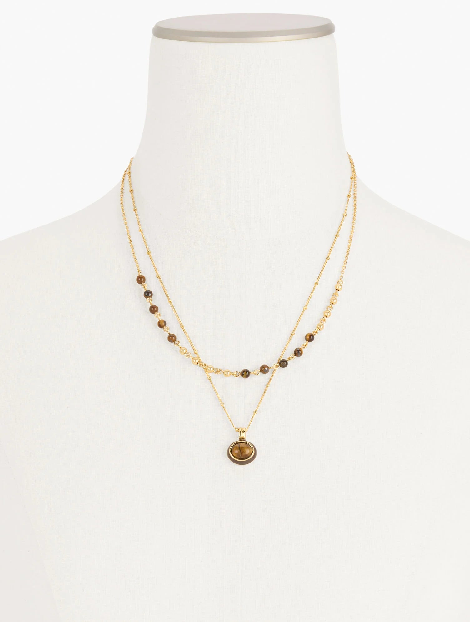Lustrous tiger’s eye pendant makes a statement on this elegantly layered necklace. Crafted with tiny, lush beads. Stunning with just-right details.