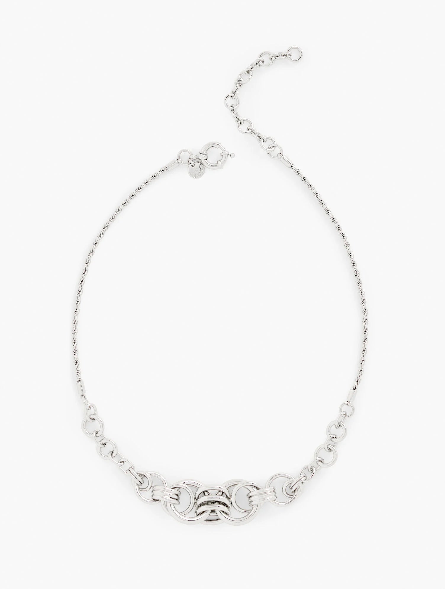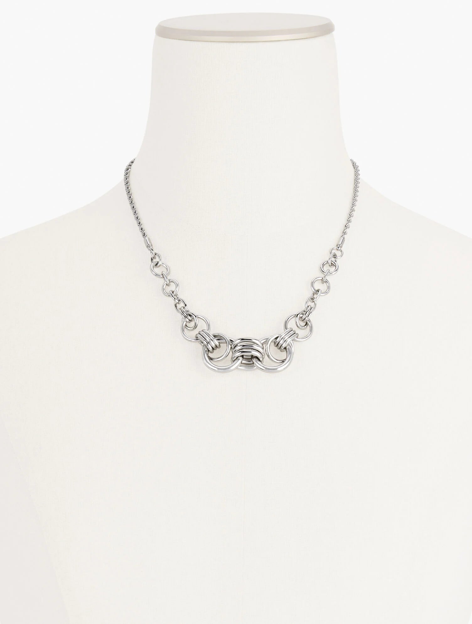 Lustrous rings interlock at the center of this bold link necklace. Sophisticated for any day of the week.